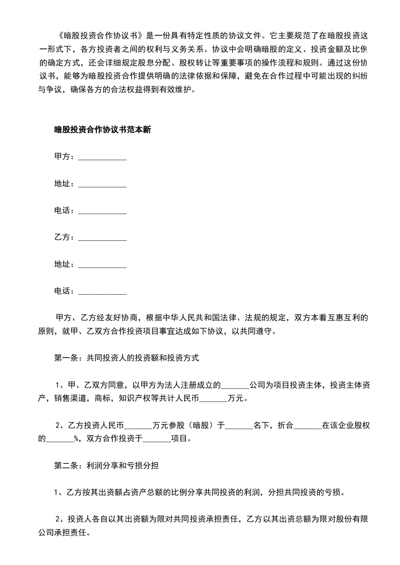 编号:公司暗股投资合作协议甲方:乙方:签订日期:年月日甲方:乙方:以上各方共同投资人(以下简称“甲方、乙方投资人”)经友好协商,根据中华人民共和国法律、法规的规定,双方本着互惠互利的原则,就甲乙双方合作投资事宜达成如下协议,以共同遵守。