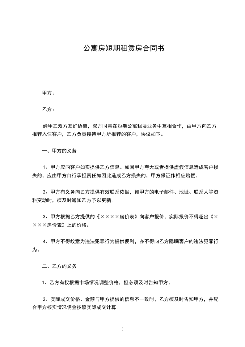 经甲乙双方友好协商,双方同意在短期公寓租赁业务中互相合作,由甲方向乙方推荐入住客户,乙方负责接待甲方所推荐的客户,协议如下。