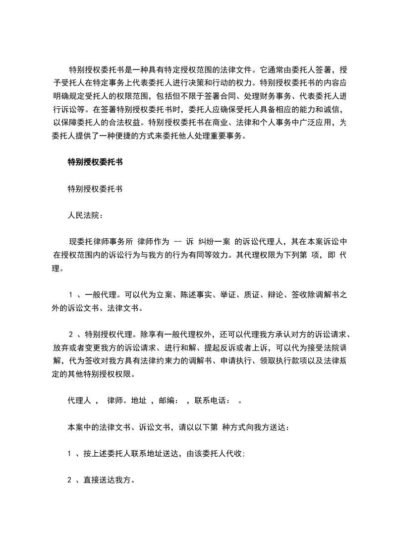 特别授权委托书是一种具有特定授权范围的法律文件。它通常由委托人签署,授予受托人在特定事务上代表委托人进行决策和行动的权力。特别授权委托书的内容应明确规定受托人的权限范围,包括但不限于签署合同、处理财务事务、代表委托人进行诉讼等。在签署特别授权委托书时,委托人应确保受托人具备相应的能力和诚信,以保障委托人的合法权益。特别授权委托书在商业、法律和个人事务中广泛应用,为委托人提供了一种便捷的方式来委托他人处理重要事务。