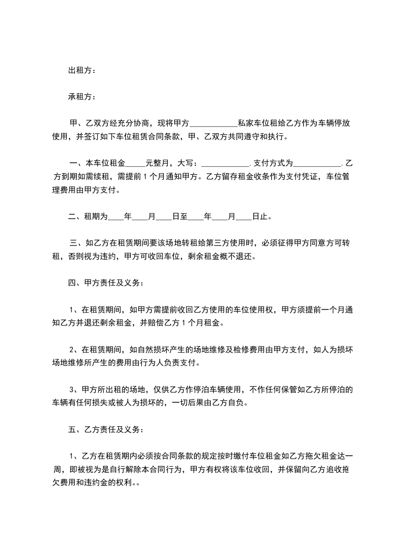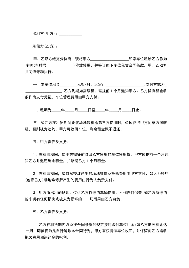 甲、乙双方经充分协商,现将甲方____________私家车位租给乙方作为车辆停放使用,并签订如下车位租赁合同条款,甲、乙双方共同遵守和执行。