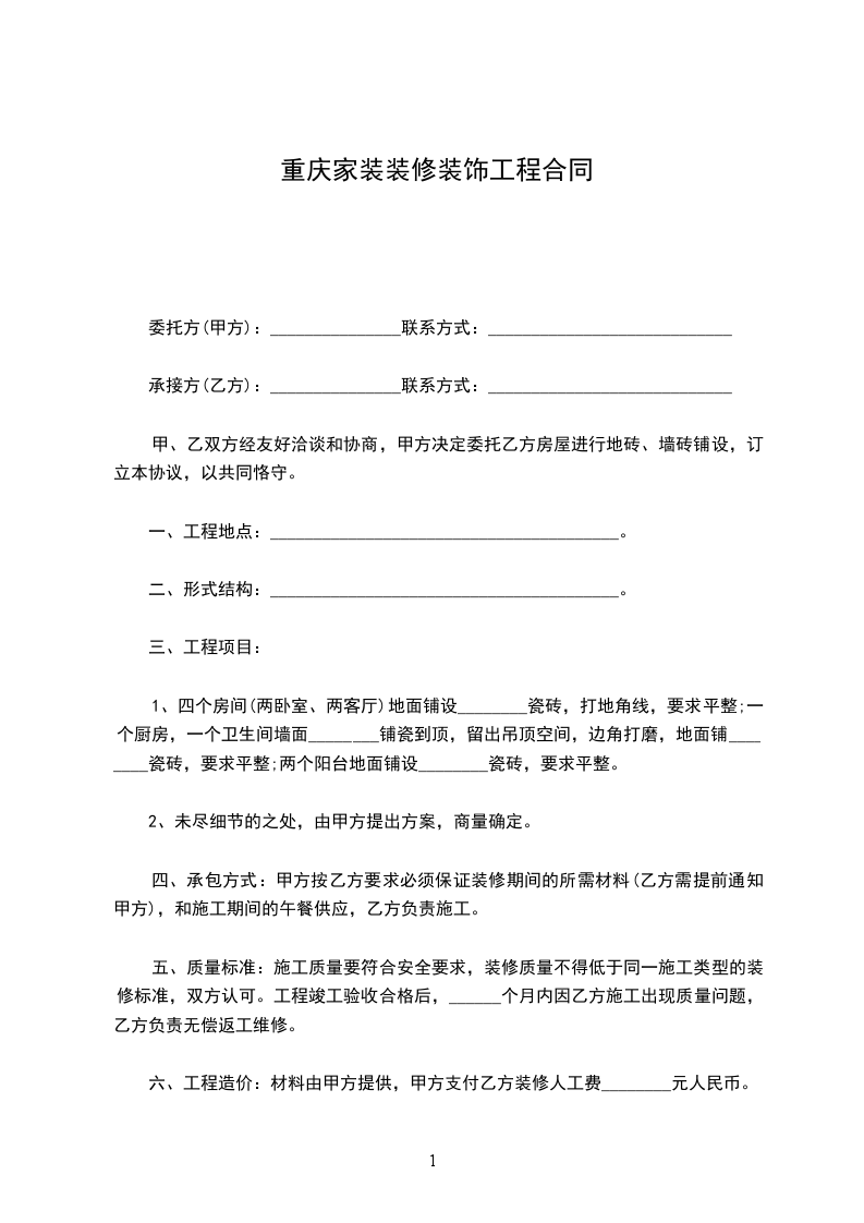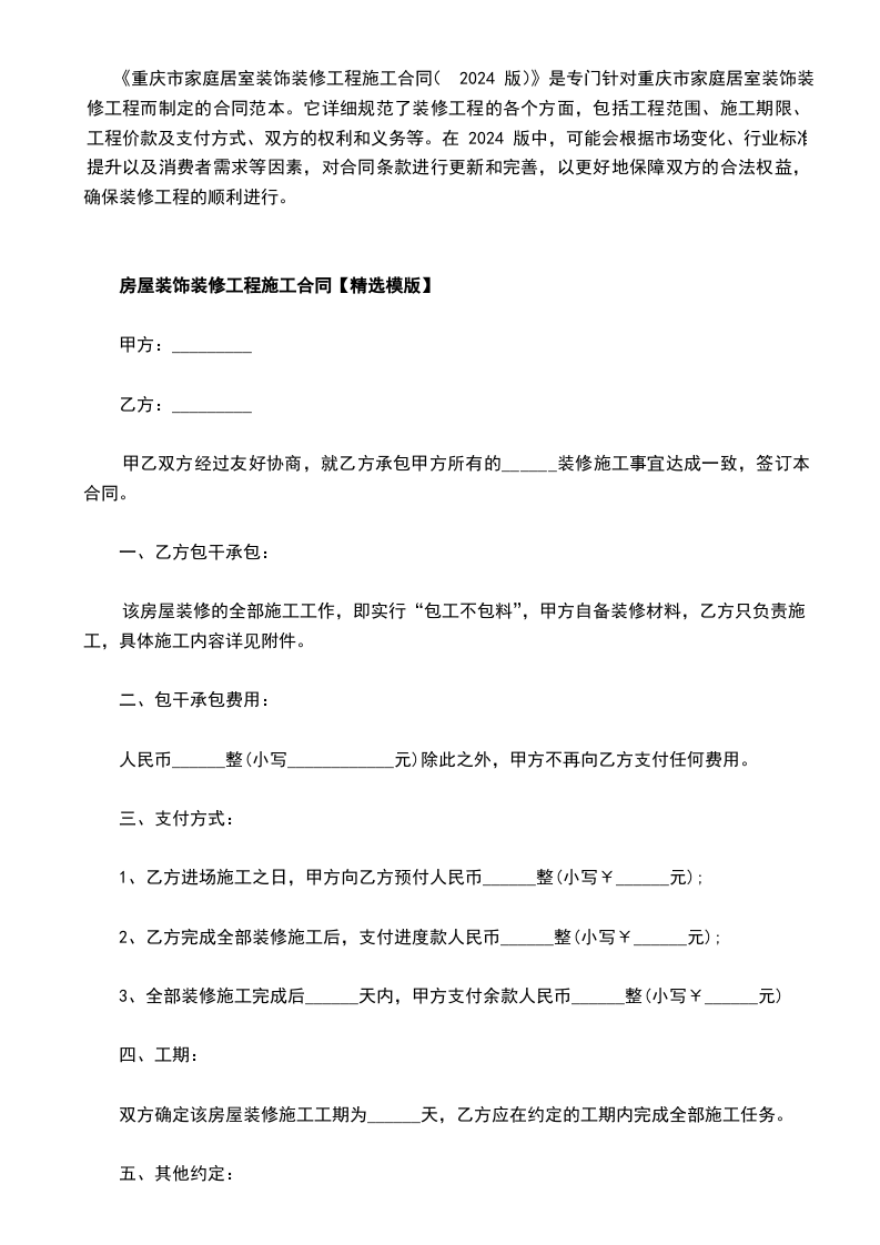 《重庆市家庭居室装饰装修工程施工合同(2024 版)》是专门针对重庆市家庭居室装饰装修工程而制定的合同范本。它详细规范了装修工程的各个方面,包括工程范围、施工期限、工程价款及支付方式、双方的权利和义务等。在 2024 版中,可能会根据市场变化、行业标准提升以及消费者需求等因素,对合同条款进行更新和完善,以更好地保障双方的合法权益,确保装修工程的顺利进行。
