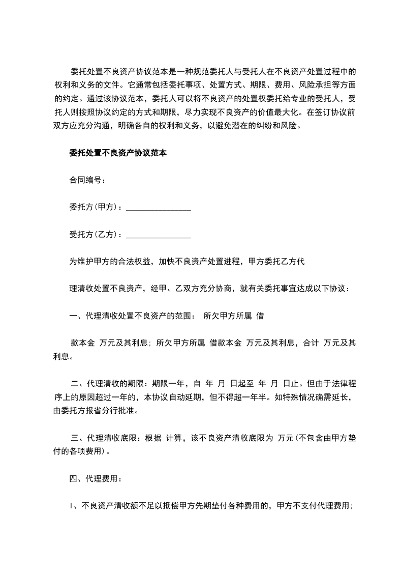 委托处置不良资产协议范本是一种规范委托人与受托人在不良资产处置过程中的权利和义务的文件。它通常包括委托事项、处置方式、期限、费用、风险承担等方面的约定。通过该协议范本,委托人可以将不良资产的处置权委托给专业的受托人,受托人则按照协议约定的方式和期限,尽力实现不良资产的价值最大化。在签订协议前,双方应充分沟通,明确各自的权利和义务,以避免潜在的纠纷和风险。