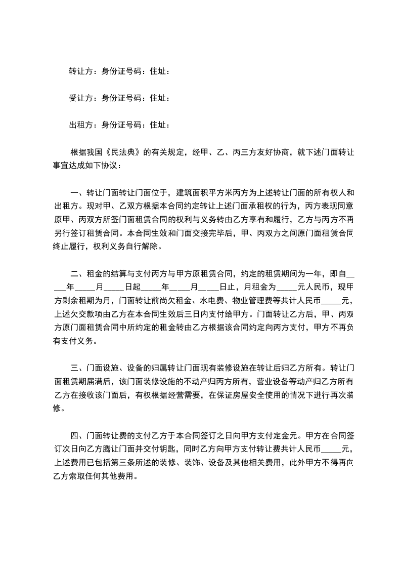 根据我国《民法典》的有关规定,经甲、乙、丙三方友好协商,就下述门面转让事宜达成如下协议: