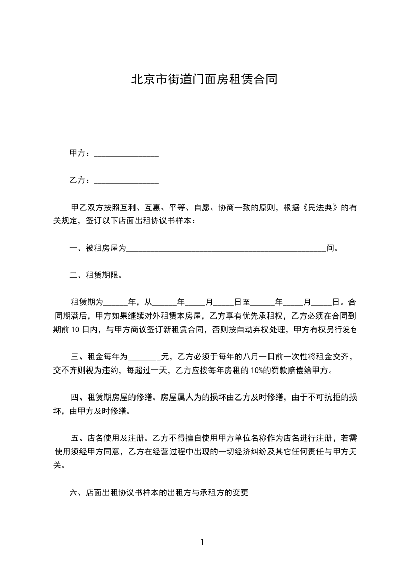甲乙双方按照互利、互惠、平等、自愿、协商一致的原则,根据《民法典》的有关规定,签订以下店面出租协议书样本: