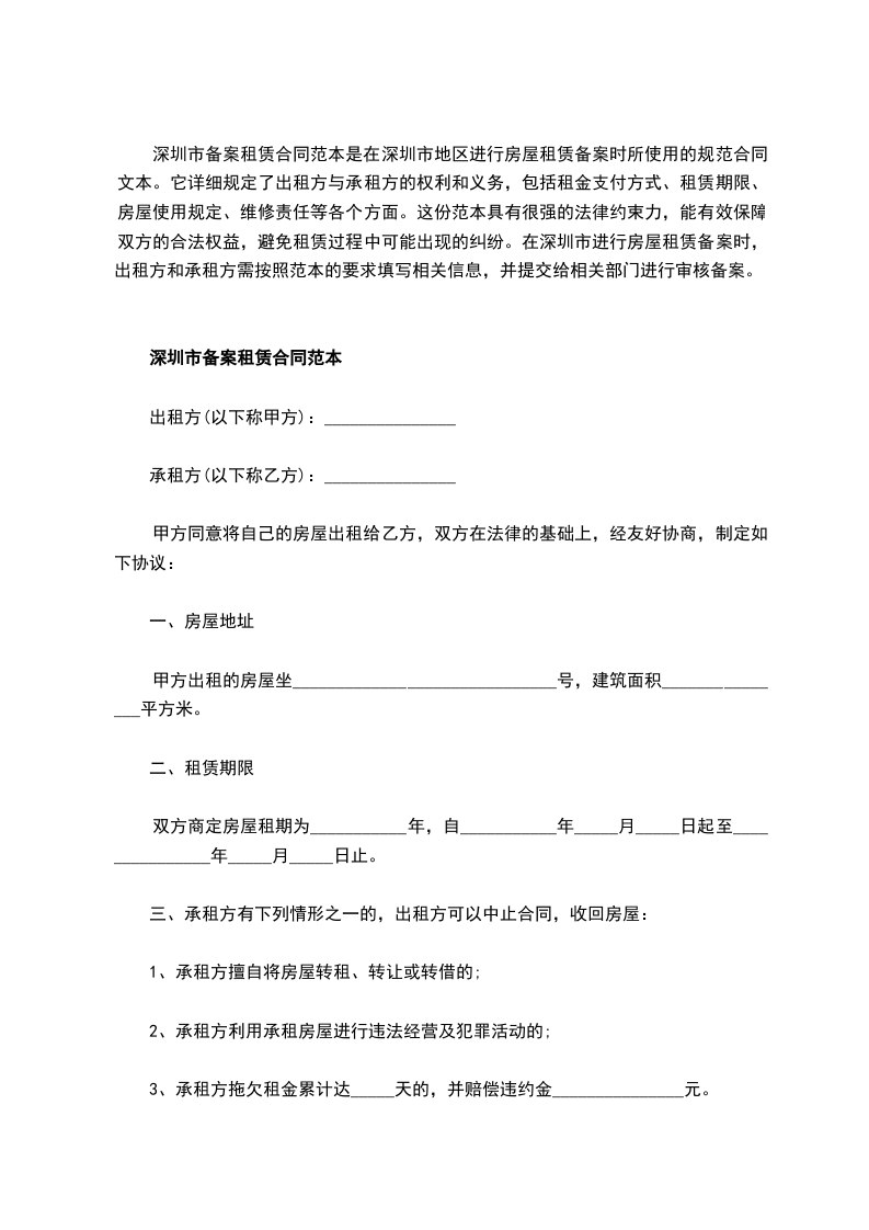 深圳市备案租赁合同范本是在深圳市地区进行房屋租赁备案时所使用的规范合同文本。它详细规定了出租方与承租方的权利和义务,包括租金支付方式、租赁期限、房屋使用规定、维修责任等各个方面。这份范本具有很强的法律约束力,能有效保障双方的合法权益,避免租赁过程中可能出现的纠纷。在深圳市进行房屋租赁备案时,出租方和承租方需按照范本的要求填写相关信息,并提交给相关部门进行审核备案。