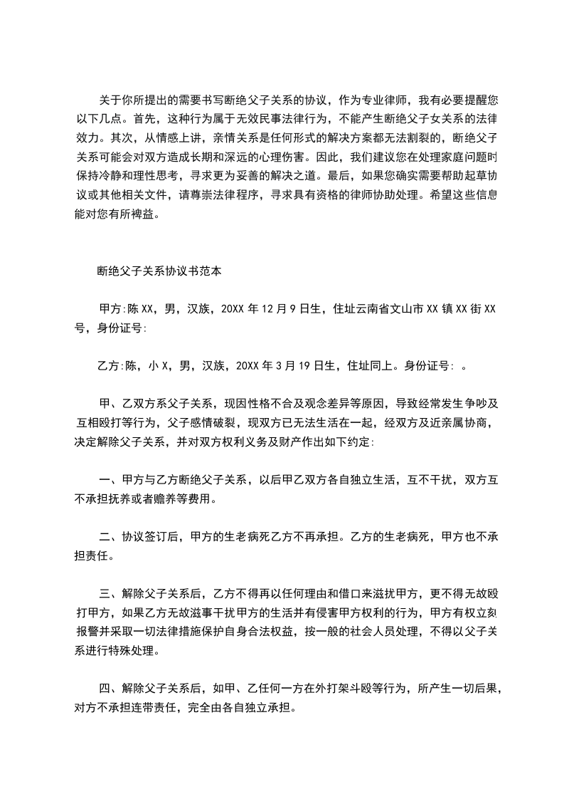 关于你所提出的需要书写断绝父子关系的协议,作为专业律师,我有必要提醒您以下几点。首先,这种行为属于无效民事法律行为,不能产生断绝父子女关系的法律效力。其次,从情感上讲,亲情关系是任何形式的解决方案都无法割裂的,断绝父子关系可能会对双方造成长期和深远的心理伤害。因此,我们建议您在处理家庭问题时保持冷静和理性思考,寻求更为妥善的解决之道。最后,如果您确实需要帮助起草协议或其他相关文件,请尊崇法律程序,寻求具有资格的律师协助处理。希望这些信息能对您有所裨益。