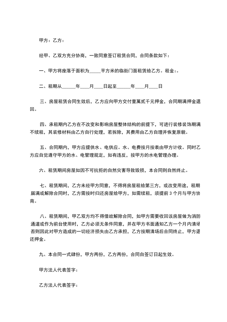 一、甲方将座落于面积为_____平方米的临街门面租赁给乙方。租金:。