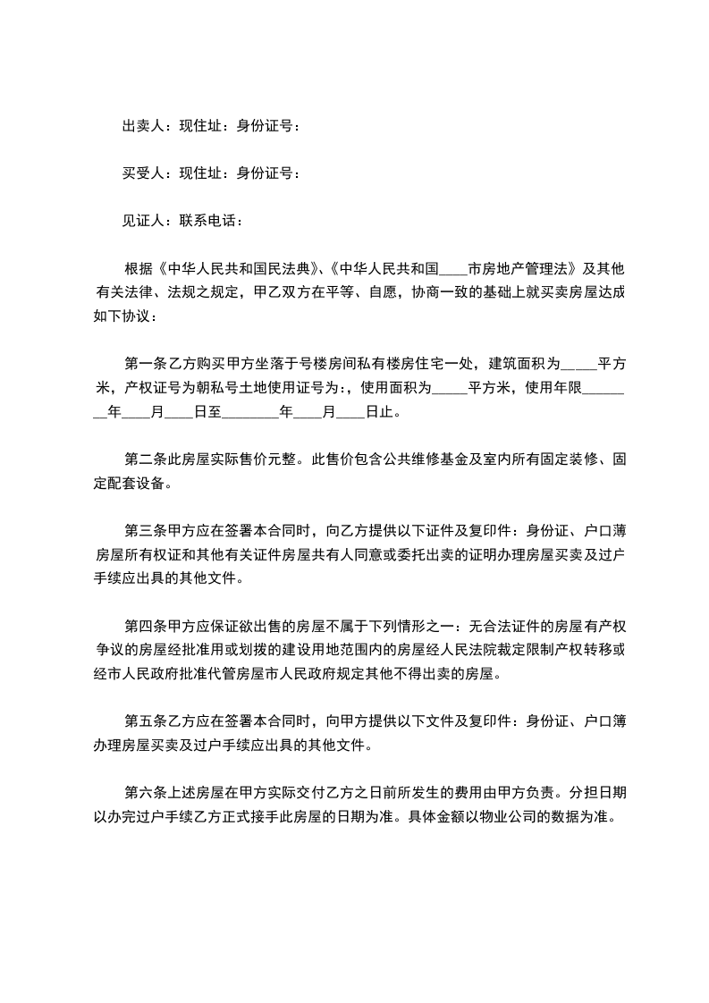 双方同意买卖下列房屋:_________区_________路_________弄_________号_________室,建筑面积共_________平方米。