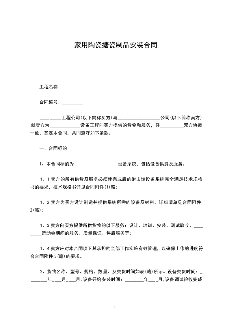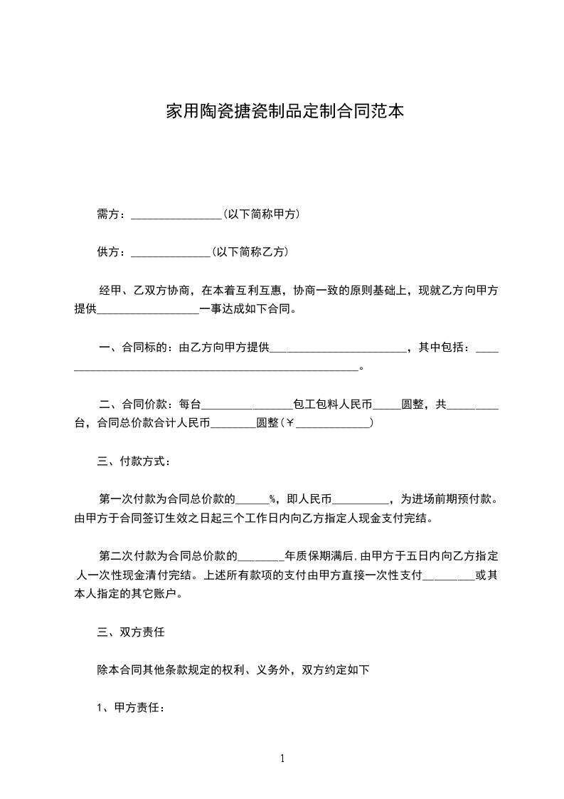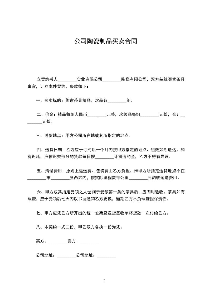 立契约书人_________实业有限公司_________陶瓷有限公司,双方兹就买卖茶具事宜,订立本件契约,条款如下: