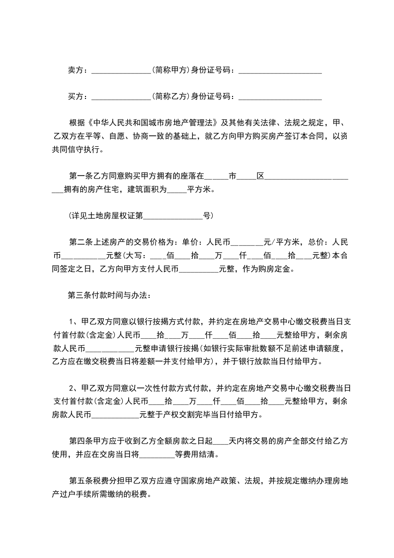 第一条乙方同意购买甲方拥有的座落在______市_____区________________________拥有的房产住宅,建筑面积为_____平方米。
