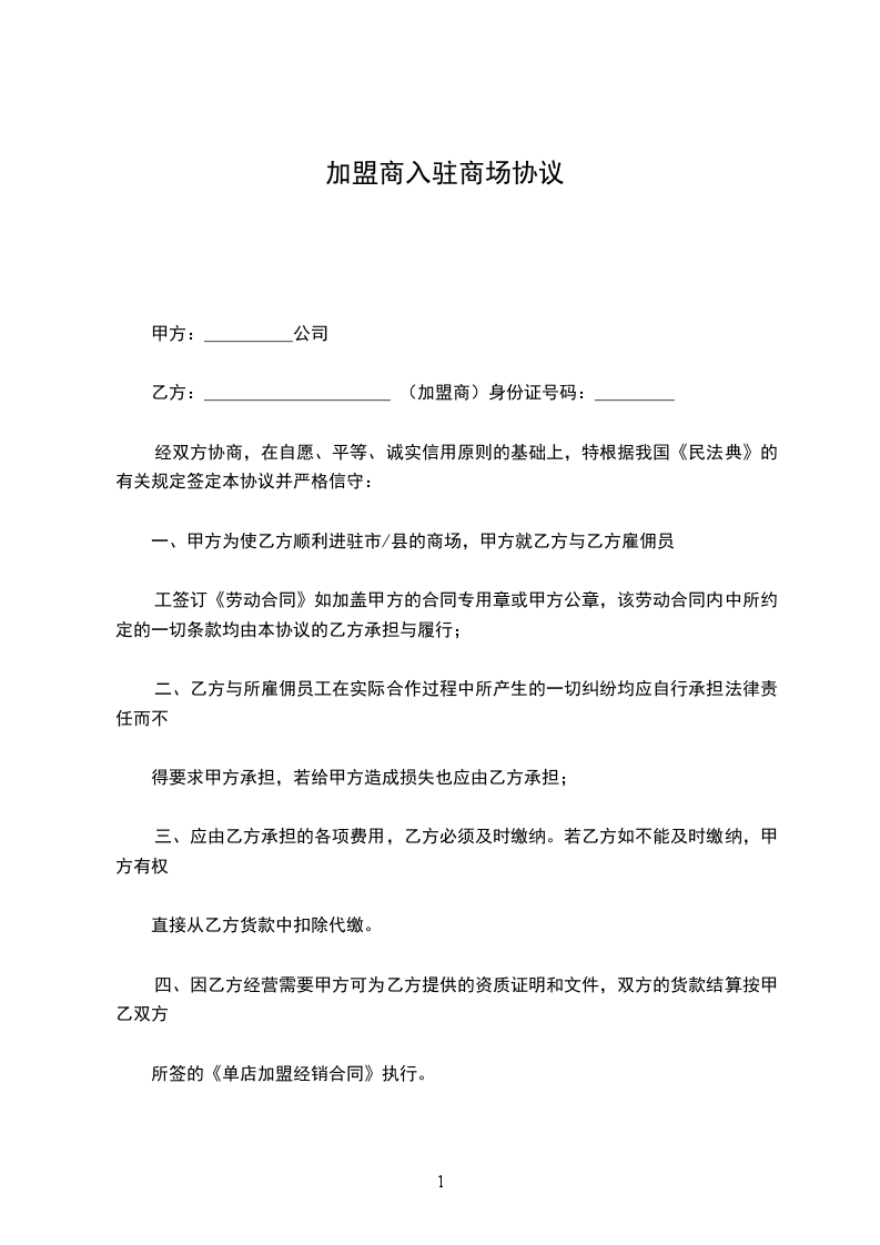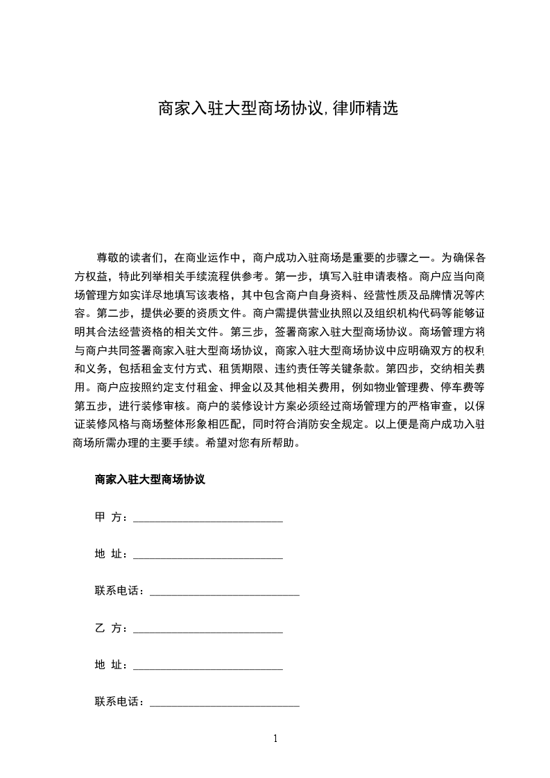 商家入驻大型商场协议,是商家与大型商场之间达成的一份具有法律约束力的契约。它明确规定了商家在商场内的经营权利与义务,包括店铺位置、经营面积、租金及相关费用、营业时间、商品种类及质量要求等方面的内容。这份协议旨在保障商场的整体运营秩序,同时也为商家提供一个规范、有序的经营环境,促进双方的合作共赢,是商家入驻大型商场过程中不可或缺的重要文件。