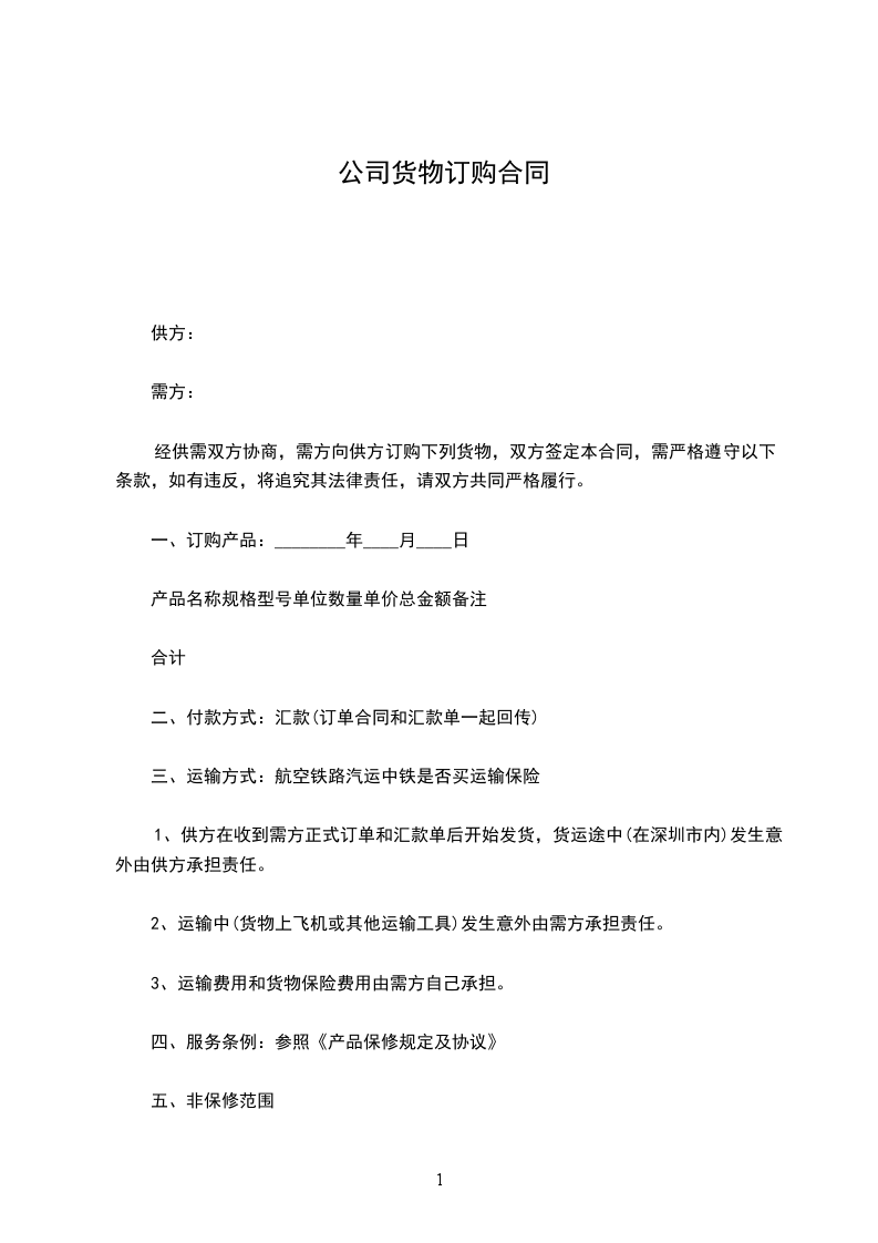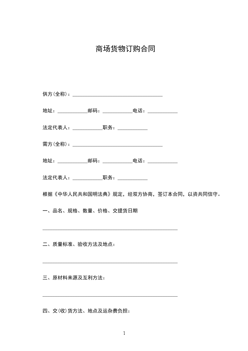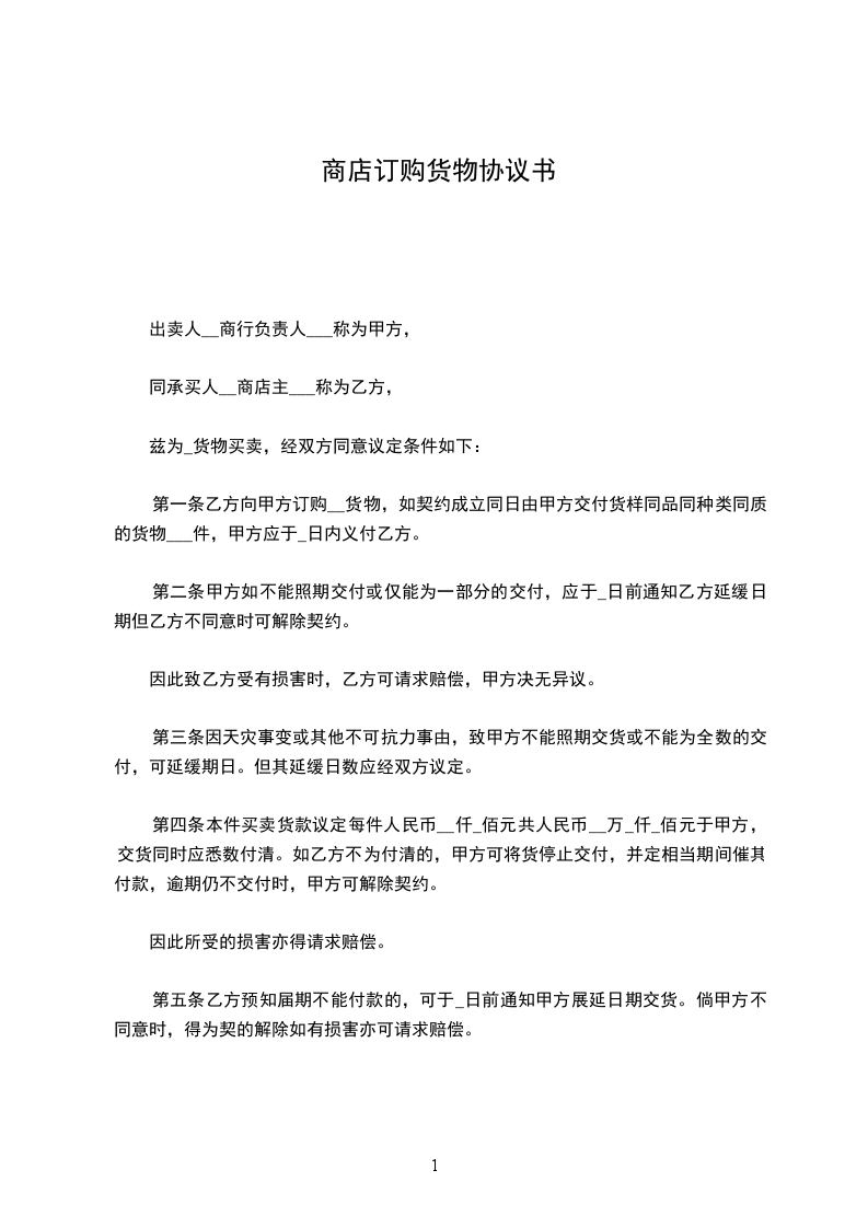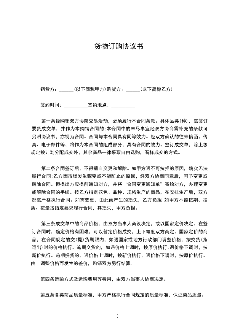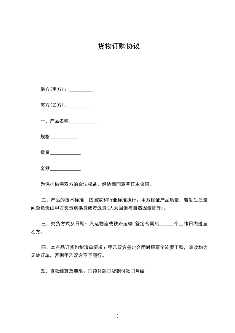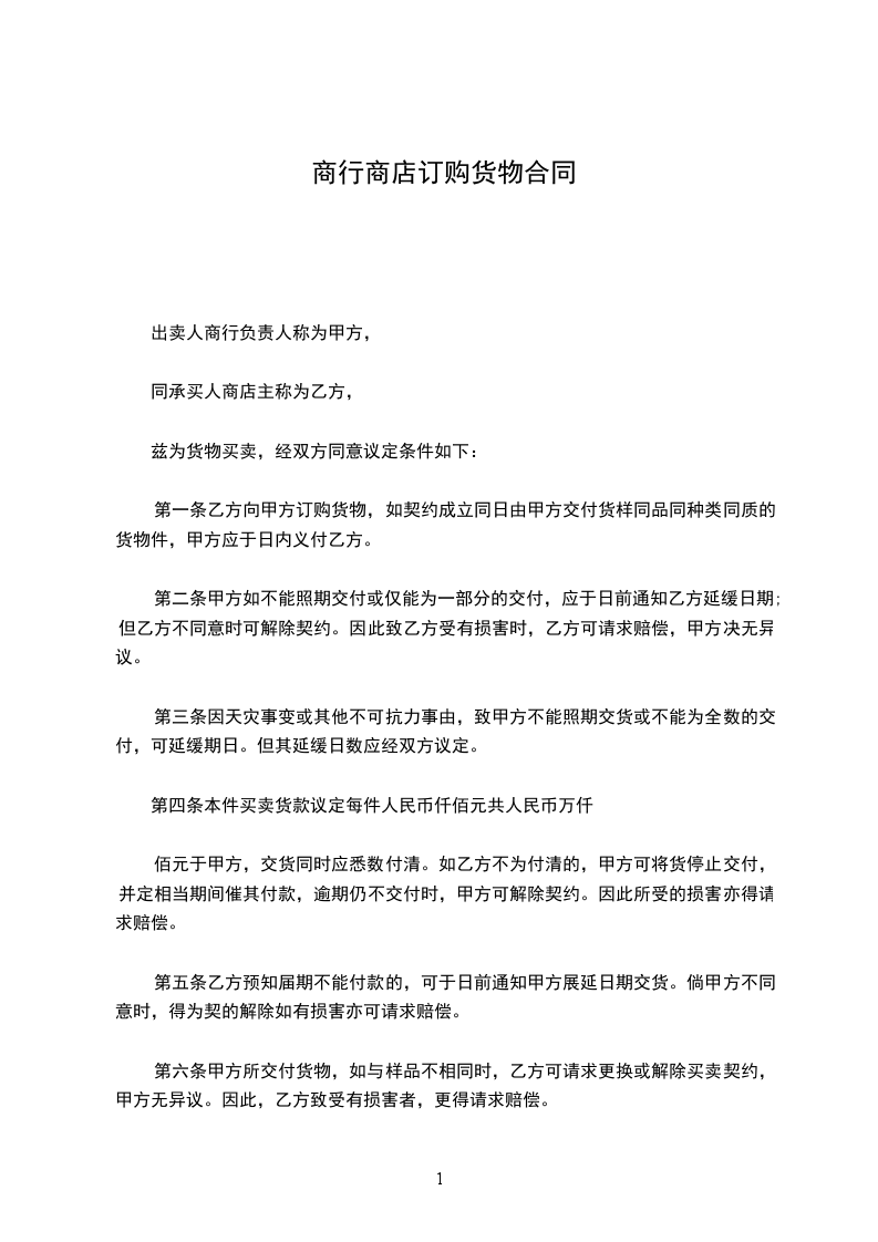 第一条乙方向甲方订购__货物,如契约成立同日由甲方交付货样同品同种类同质的货物___件,甲方应于_日内义付乙方。