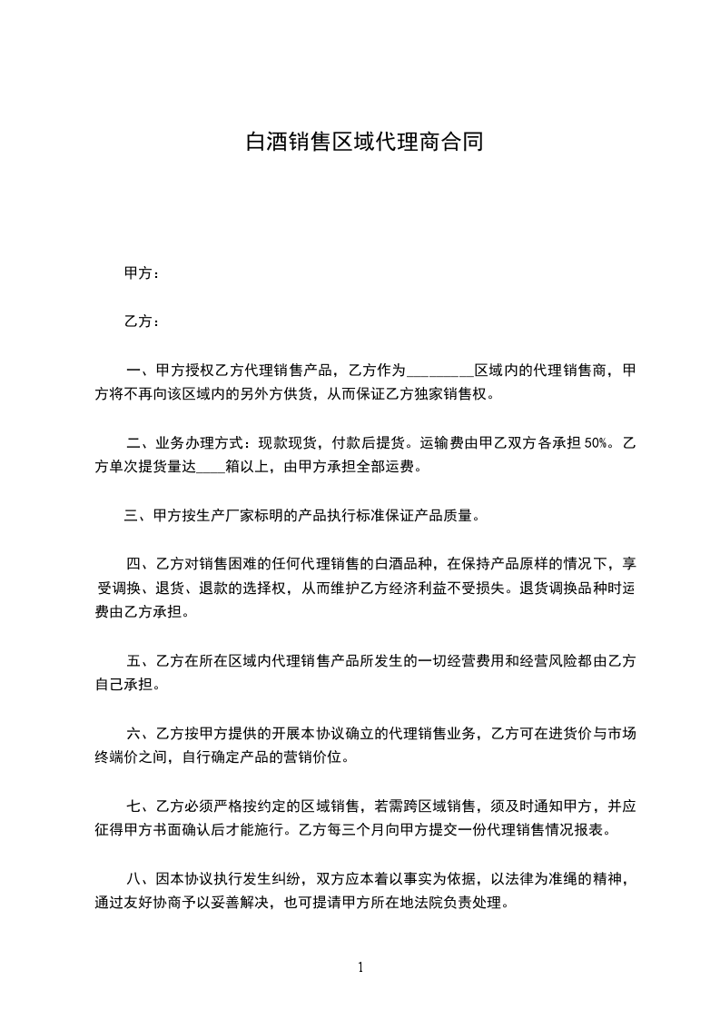 一、甲方授权乙方代理销售产品,乙方作为_________区域内的代理销售商,甲方将不再向该区域内的另外方供货,从而保证乙方独家销售权。
