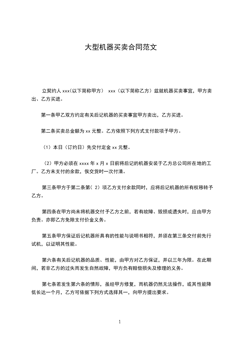 立契约人xxx(以下简称甲方)xxx(以下简称乙方)兹就机器买卖事宜,甲方卖出、乙方买进。