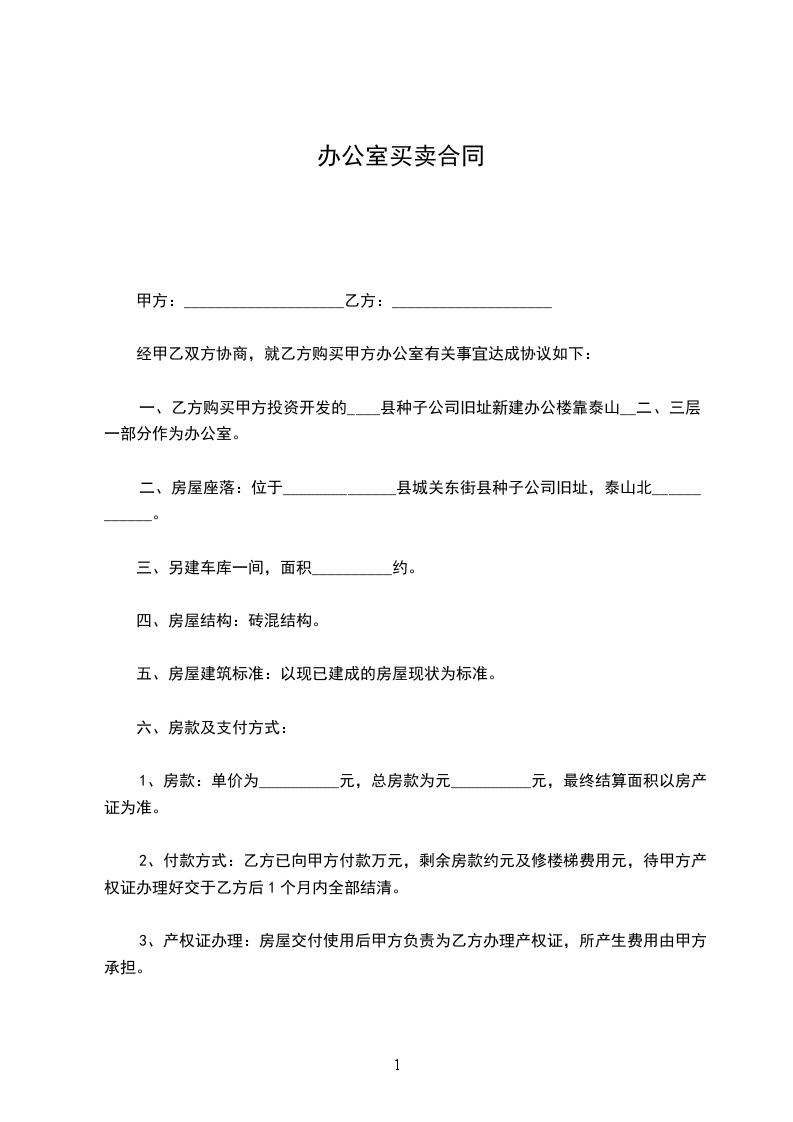 一、乙方购买甲方投资开发的____县种子公司旧址新建办公楼靠泰山__二、三层一部分作为办公室。