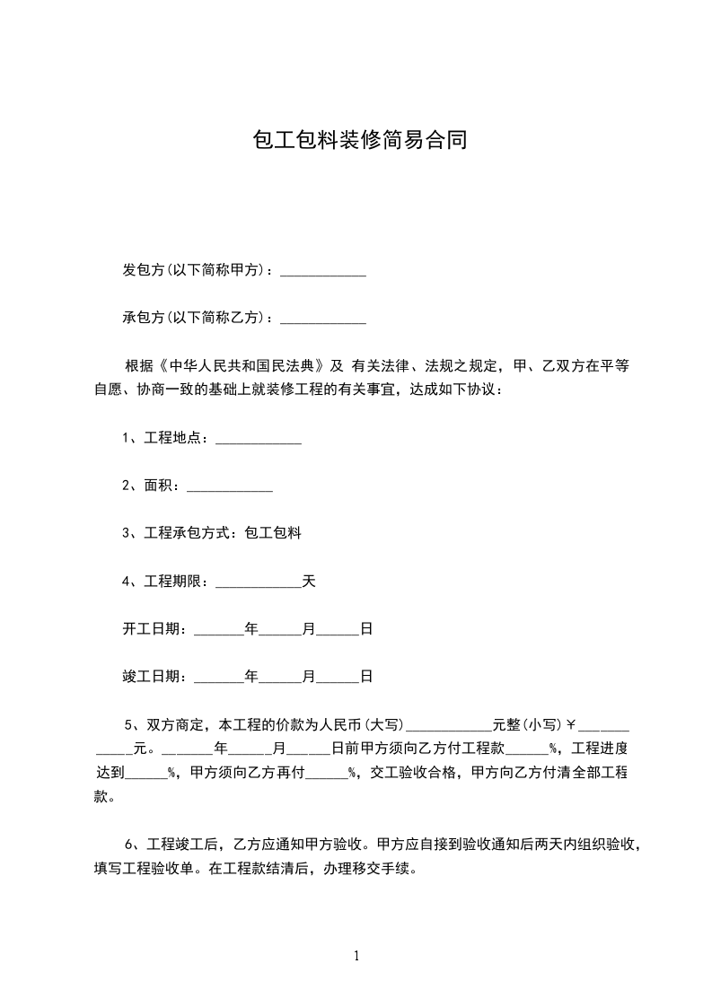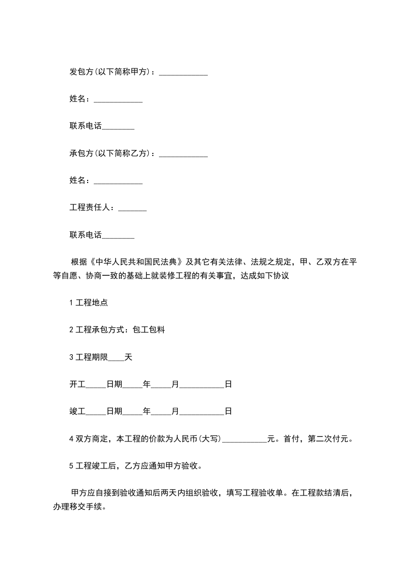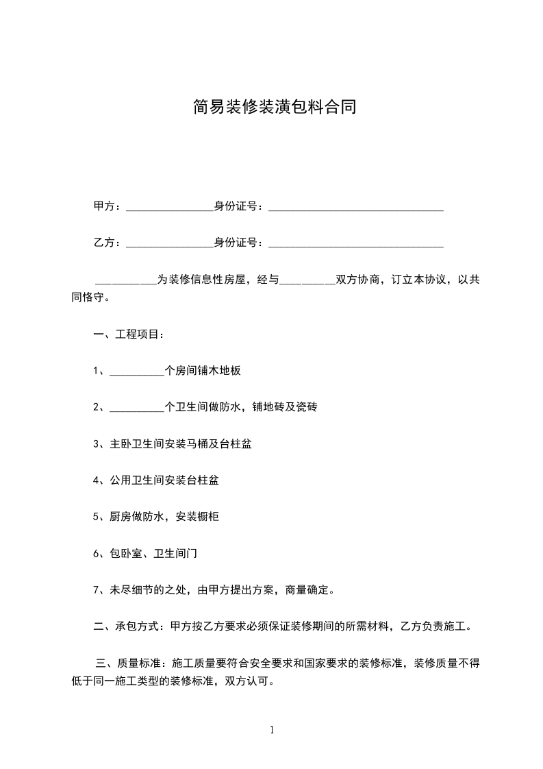二、承包方式:甲方按乙方要求必须保证装修期间的所需材料,乙方负责施工。
