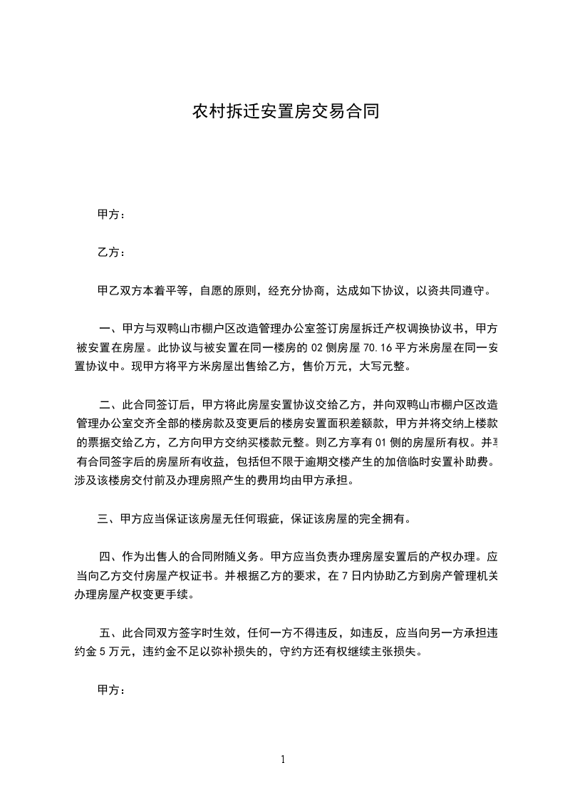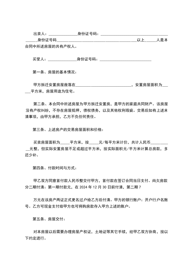 第二条、本合同中所述房屋为甲方拆迁安置房,是甲方的家庭共同财产。该房屋没有产权纠纷,不存在房屋抵押,债权债务,以及其他权利瑕疵。交易后如有上述未清事项,由甲方承担,乙方不负任何责任。