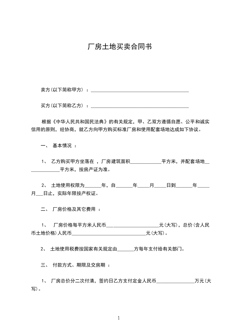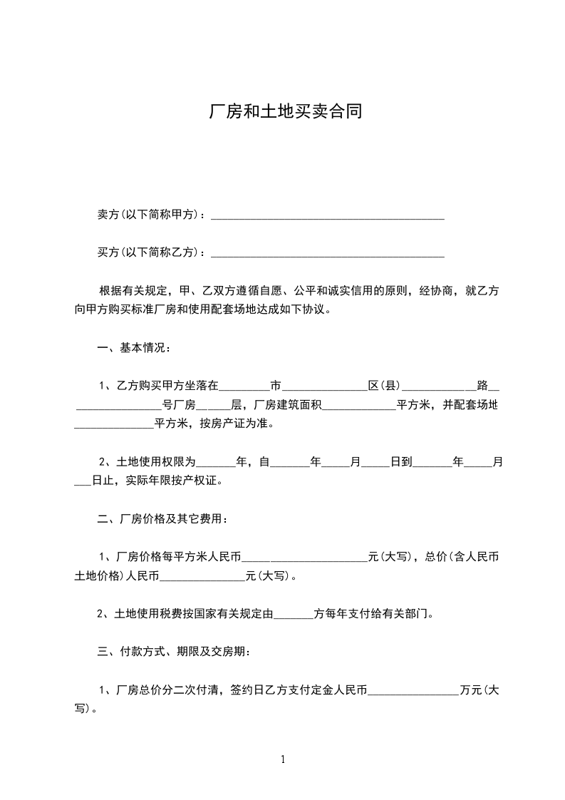 1、厂房价格每平方米人民币______________________元,总价人民币_______________________________元。