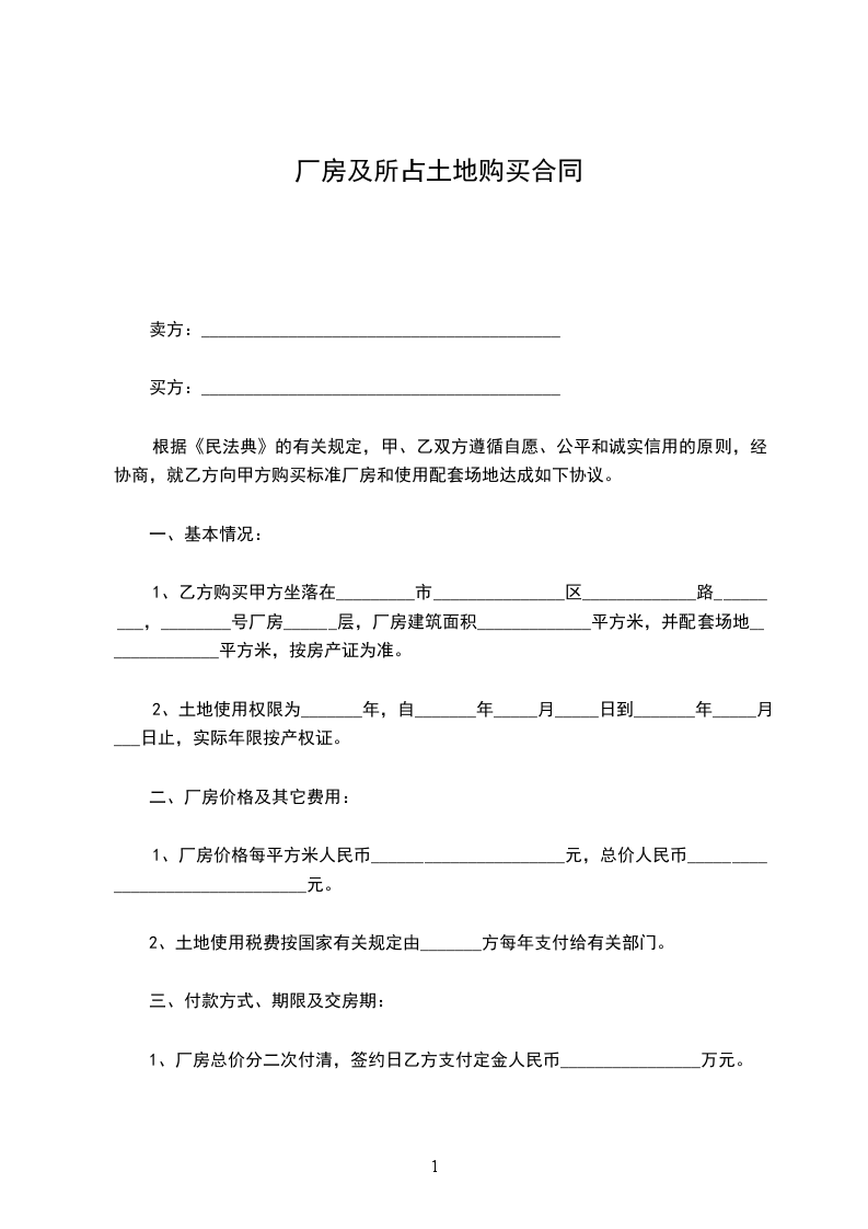 1、乙方购买甲方坐落在_________市_______________区_____________路_________,________号厂房______层,厂房建筑面积_____________平方米,并配套场地______________平方米,按房产证为准。