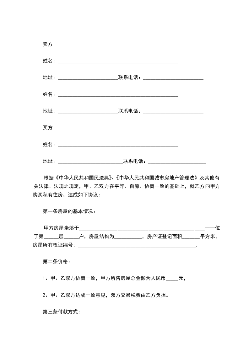 根据《中华人民共和国民法典》、《中华人民共和国城市房地产管理法》及其他有关法律、法规之规定,甲、乙双方在平等、自愿、协商一致的基础上,就乙方向甲方购买私有住房,达成如下协议: