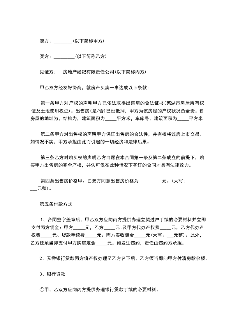 1.合同签字盖章后,甲乙双方应向丙方提供办理立契过户手续的必要材料并立即支付丙方佣金:甲方_______元,乙方_______元;及甲方代办产权费_________元,乙方代办产权费_________元、贷款手续费_________元。丙方实收佣金_________元。此外,乙方还须当即支付甲方购房定金_________元。如发生违约,责任由违约方承担。