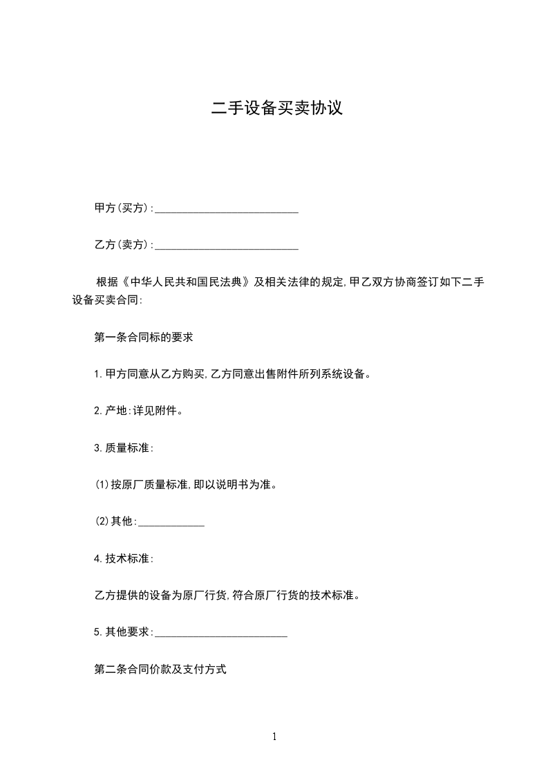 根据《中华人民共和国民法典》及相关法律的规定,甲乙双方协商签订如下二手设备买卖合同:
