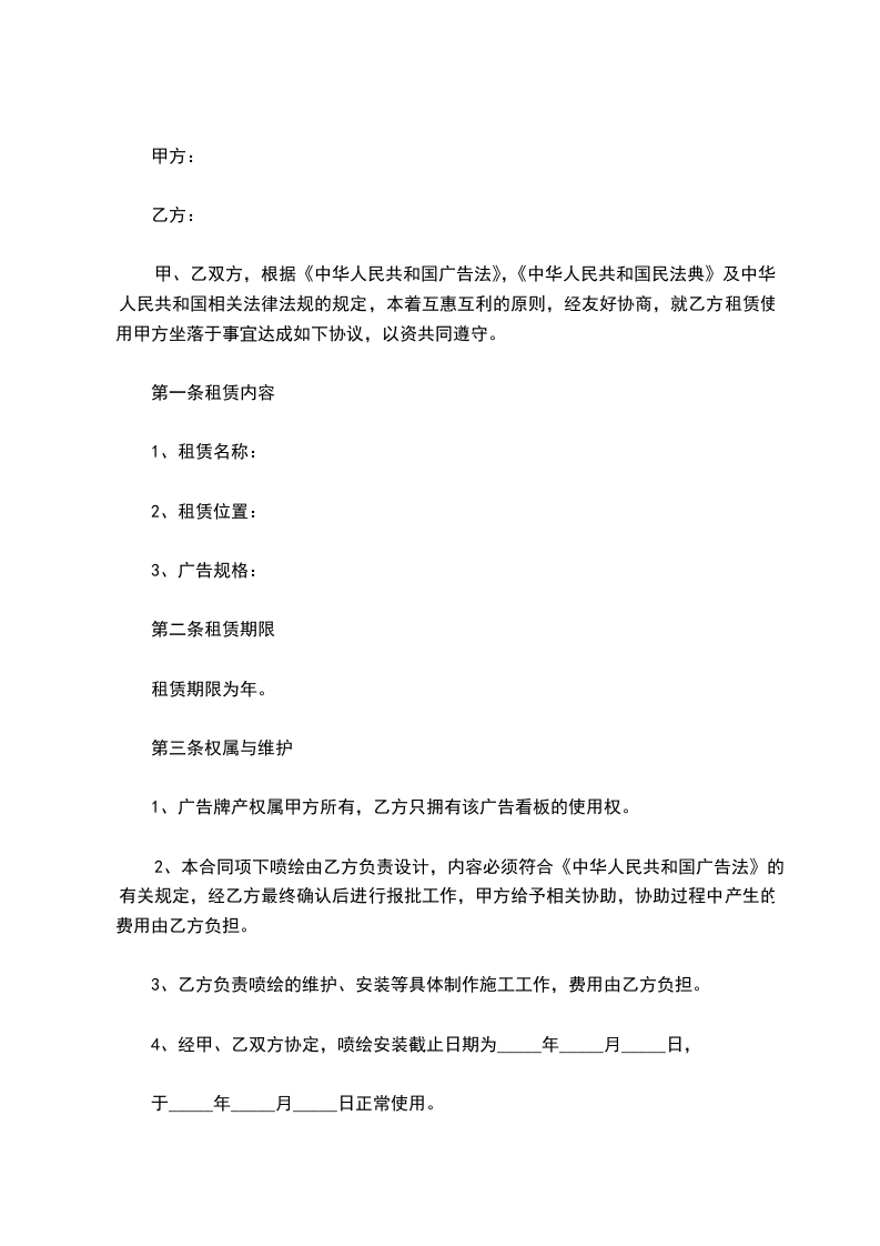 1、广告牌产权属甲方所有,乙方只拥有该广告看板的使用权。