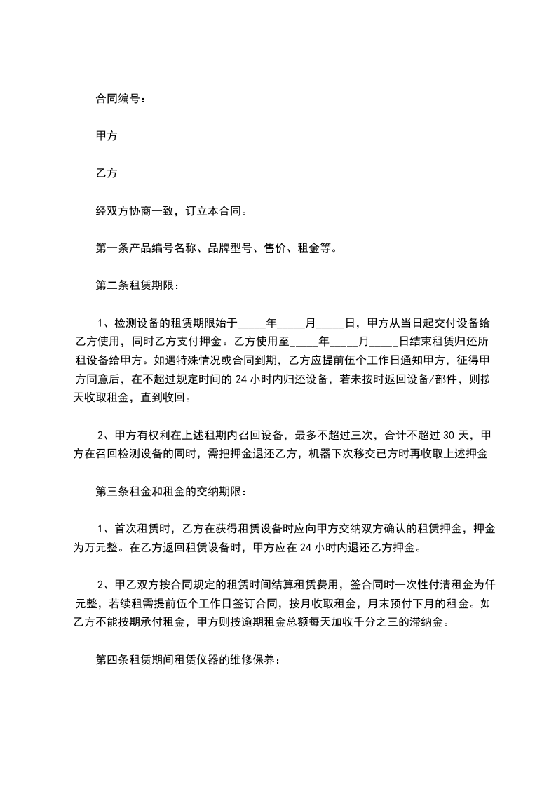 1、检测设备的租赁期限始于_____年_____月_____日,甲方从当日起交付设备给乙方使用,同时乙方支付押金。乙方使用至_____年_____月_____日结束租赁归还所租设备给甲方。如遇特殊情况或合同到期,乙方应提前伍个工作日通知甲方,征得甲方同意后,在不超过规定时间的24小时内归还设备,若未按时返回设备/部件,则按天收取租金,直到收回。