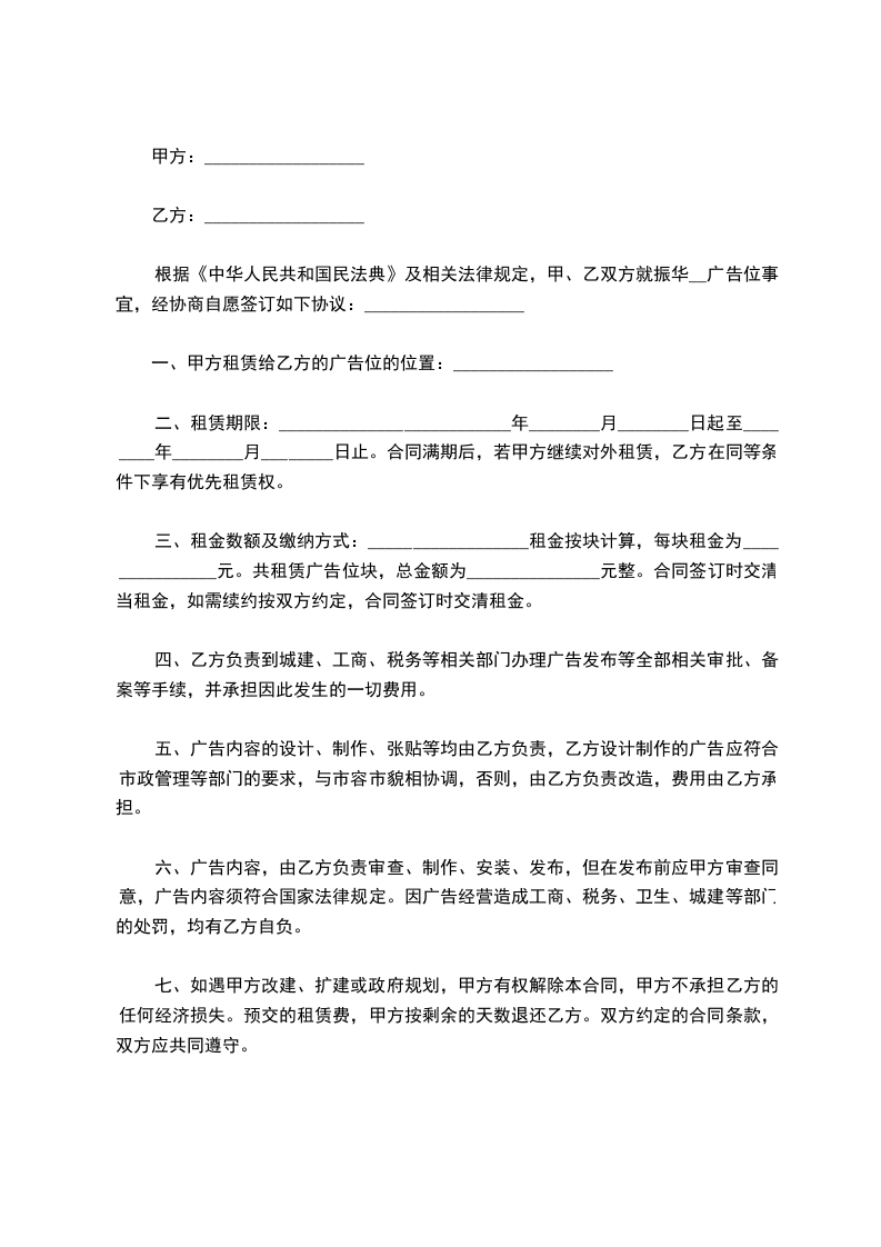 根据《中华人民共和国民法典》及相关法律规定,甲、乙双方就振华__广告位事宜,经协商自愿签订如下协议:__________________