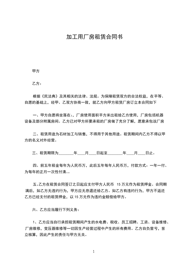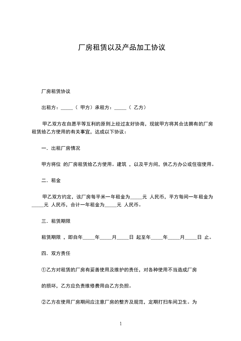 一、甲方自愿将坐落在:,厂房使用面积平方米出租给乙方使用,厂房包括机器设备及部分附属房间。乙方已对甲方所要承租的厂房做了充分了解,愿意承包该厂房。