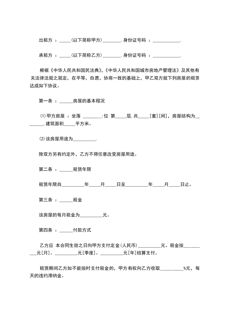 三、租金及交纳:每月_____元,乙方应每月付一次,先付后住。第一次乙方应于甲方将房屋交付同时,将房租付给甲方;第二次及以后付租金,乙方应提前一个月付清。