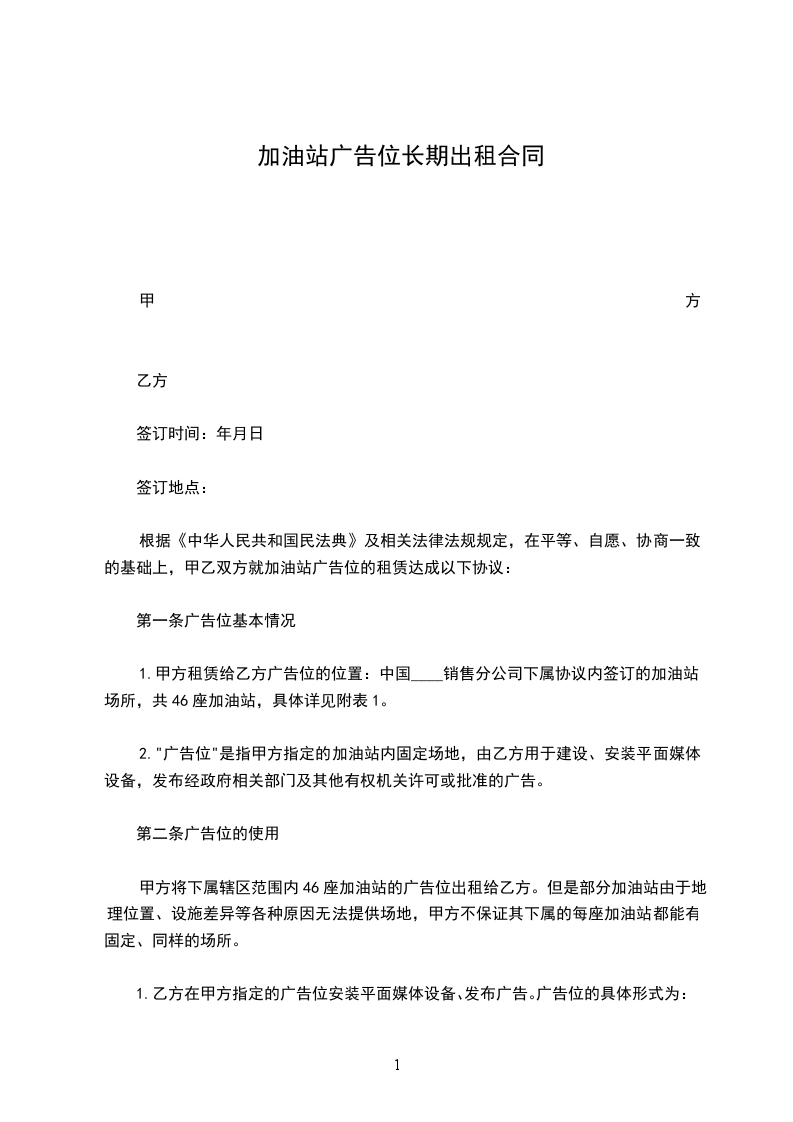 1.甲方租赁给乙方广告位的位置:中国____销售分公司下属协议内签订的加油站场所,共46座加油站,具体详见附表1。
