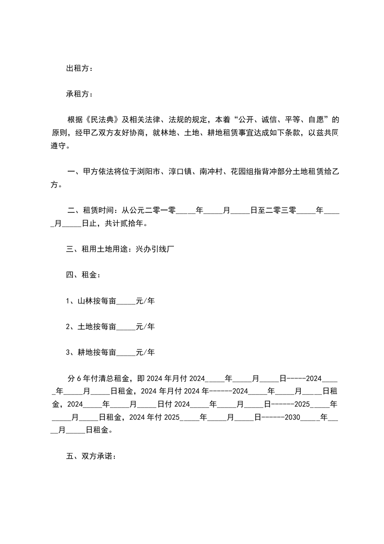 一、甲方依法将位于浏阳市、淳口镇、南冲村、花园组指背冲部分土地租赁给乙方。
