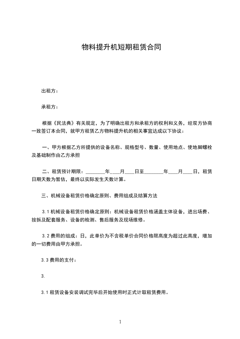 根据《民法典》有关规定,为了明确出租方和承租方的权利和义务,经双方协商一致签订本合同,就甲方租赁乙方物料提升机的相关事宜达成以下协议: