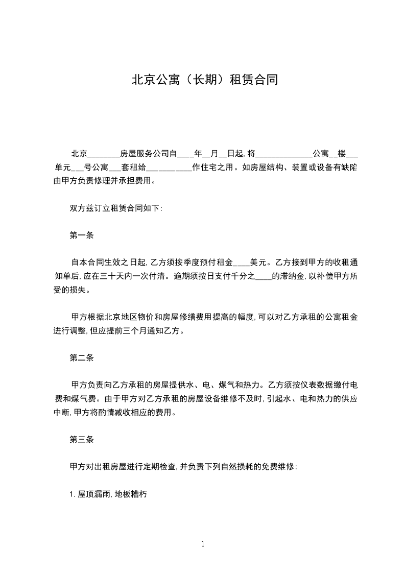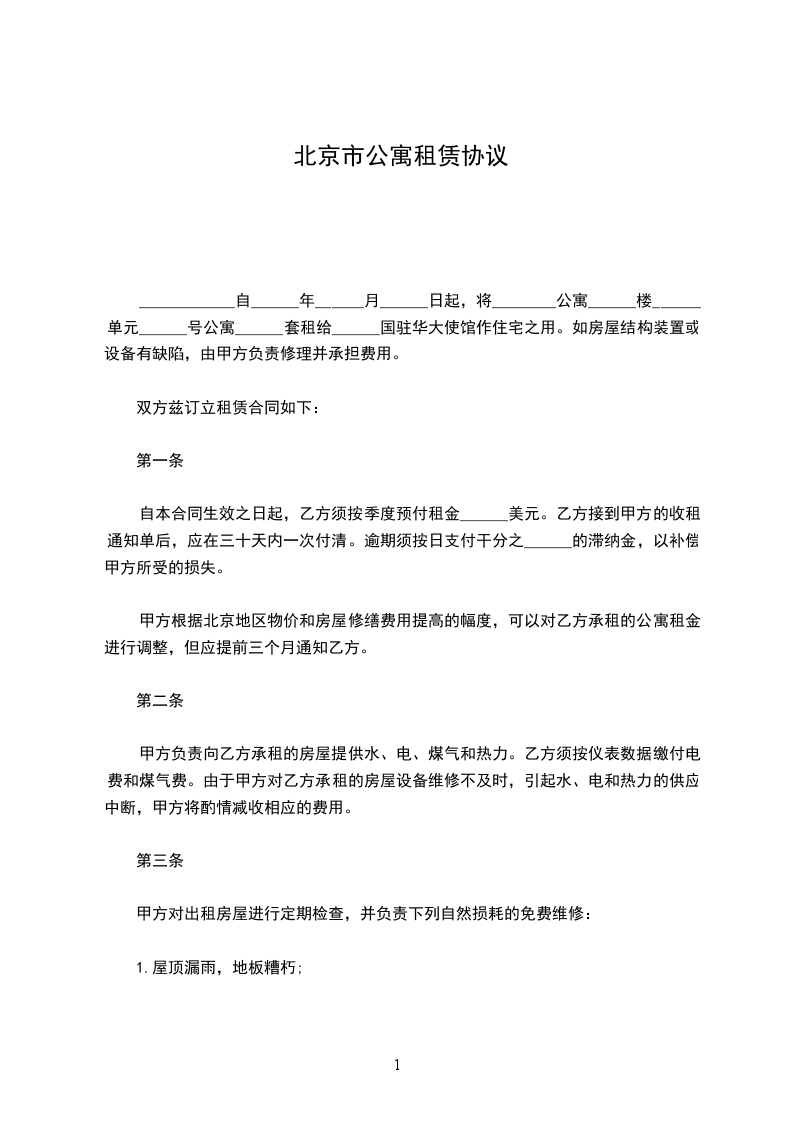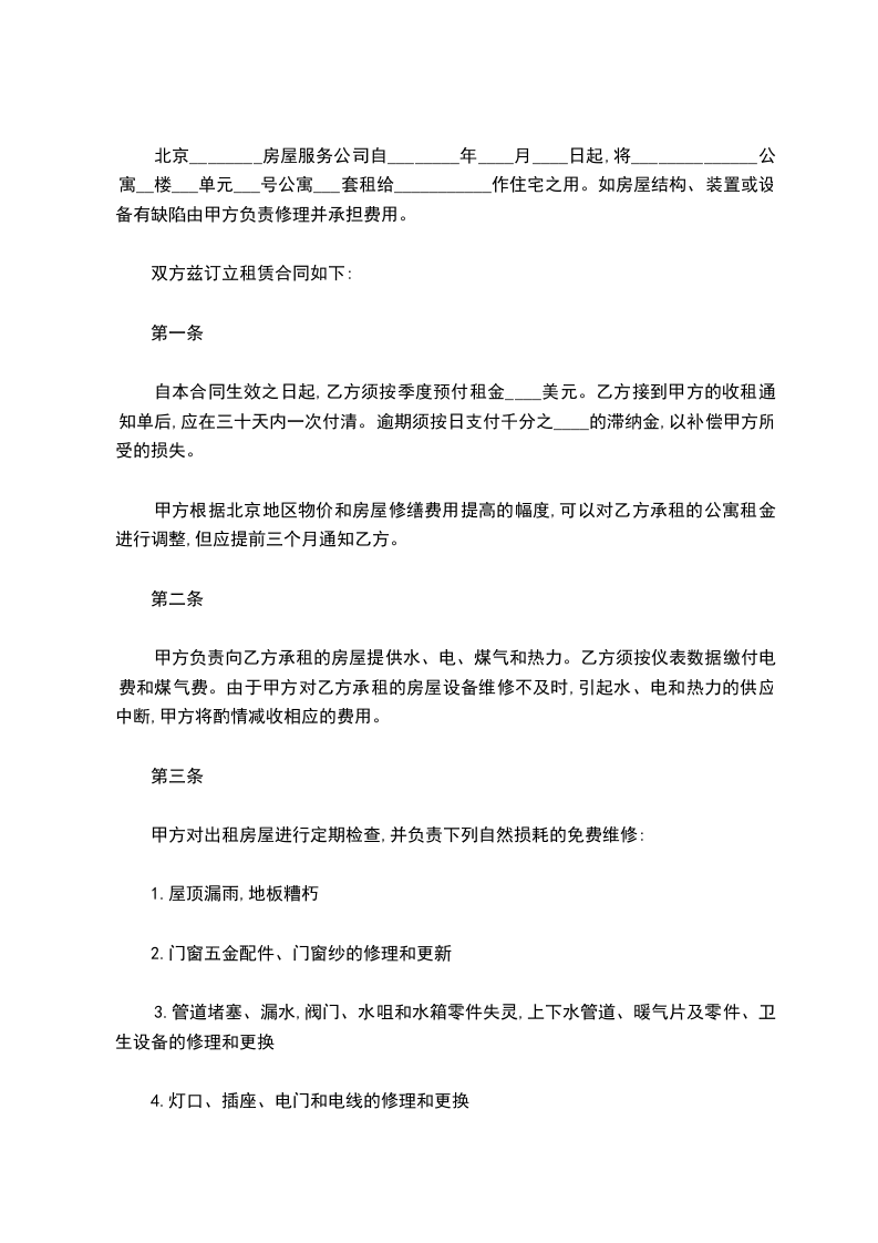 北京________房屋服务公司自________年____月____日起,将______________公寓__楼___单元___号公寓___套租给___________作住宅之用。如房屋结构、装置或设备有缺陷由甲方负责修理并承担费用。