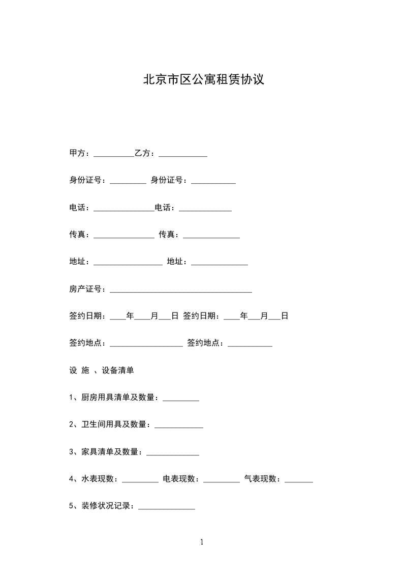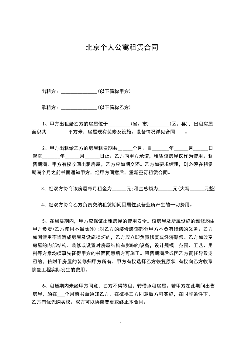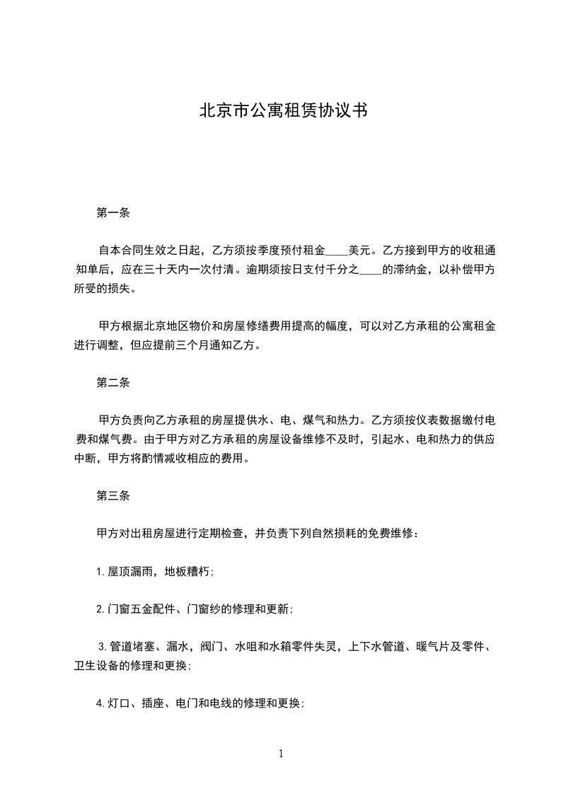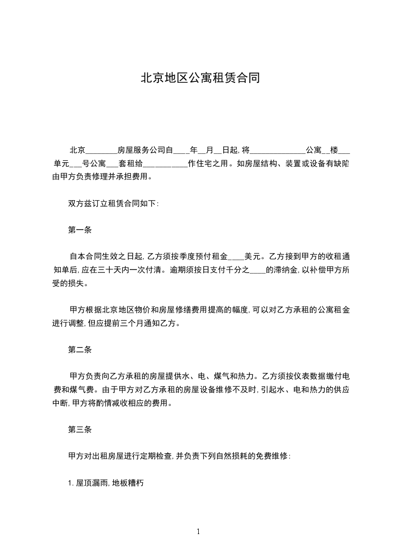 北京________房屋服务公司自________年____月____日起,将______________公寓__楼___单元___号公寓___套租给___________作住宅之用。如房屋结构、装置或设备有缺陷由甲方负责修理并承担费用。