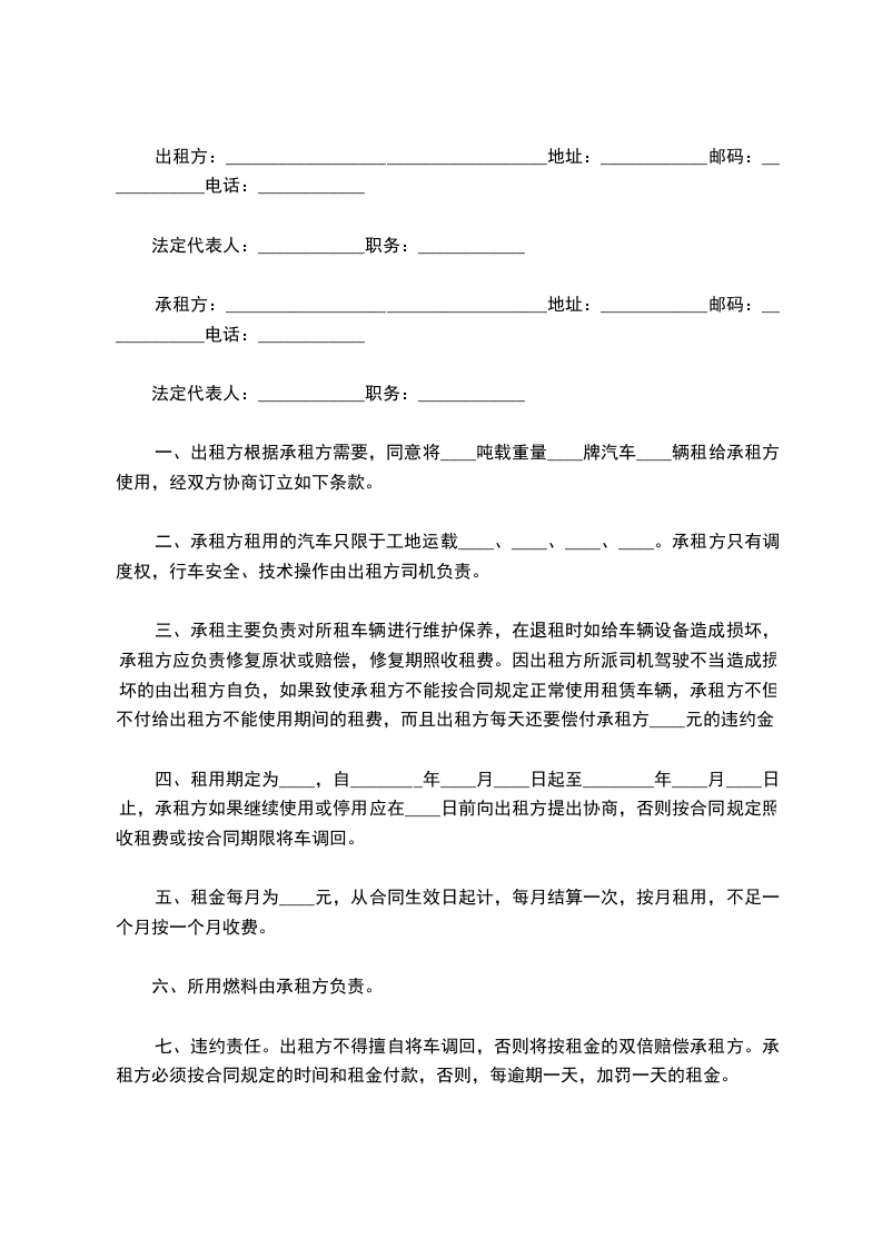 一、出租方根据承租方需要,同意将____吨载重量____牌汽车____辆租给承租方使用,经双方协商订立如下条款。