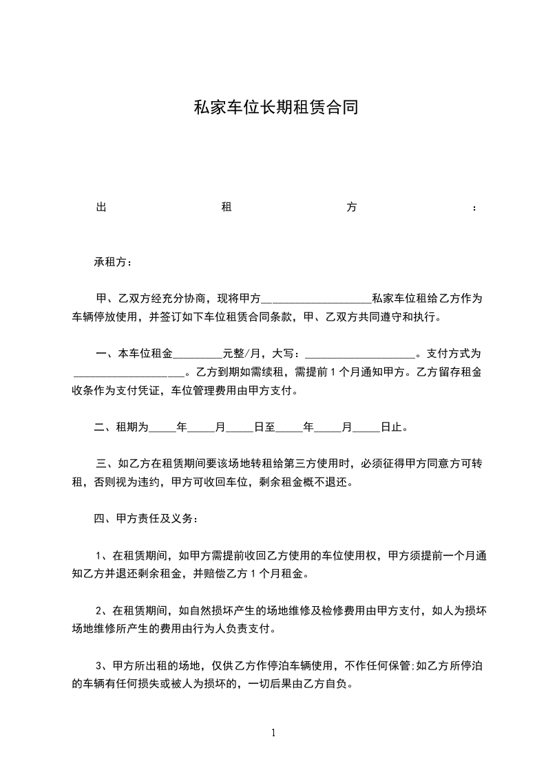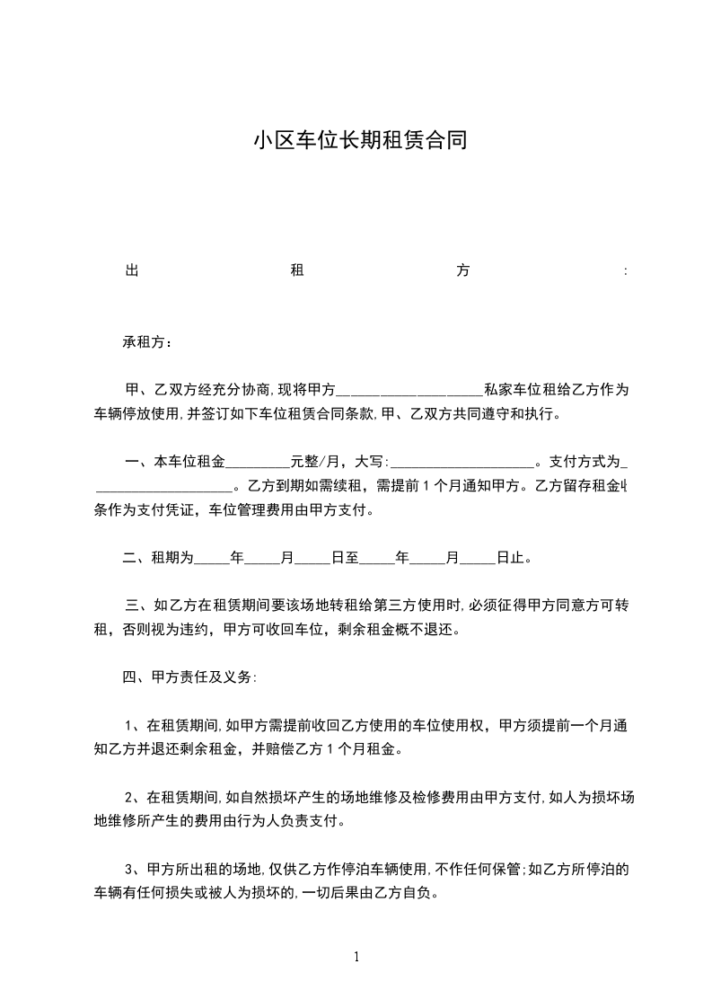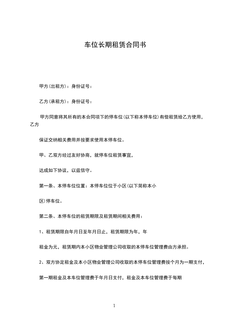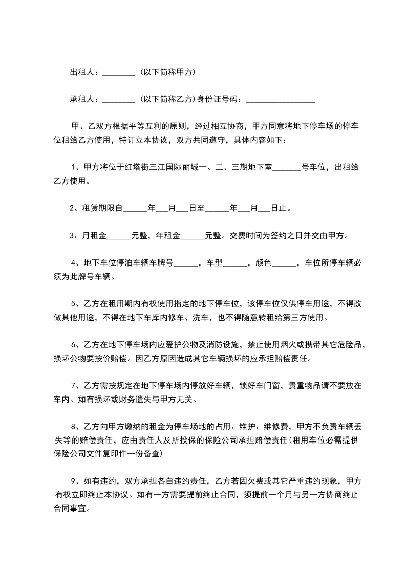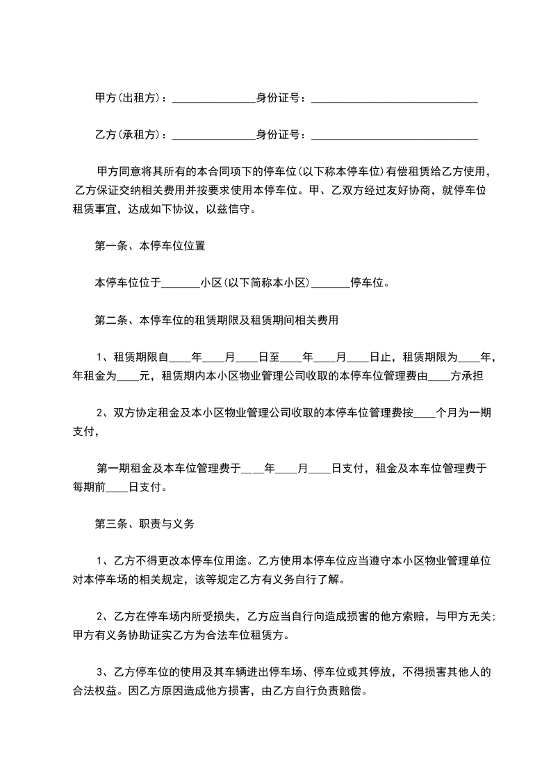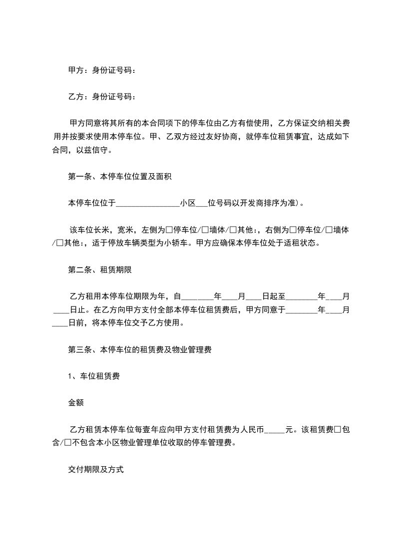 乙方租用本停车位期限为年,自________年____月____日起至________年____月____日止。在乙方向甲方支付全部本停车位租赁费后,甲方同意于________年____月____日前,将本停车位交予乙方使用。