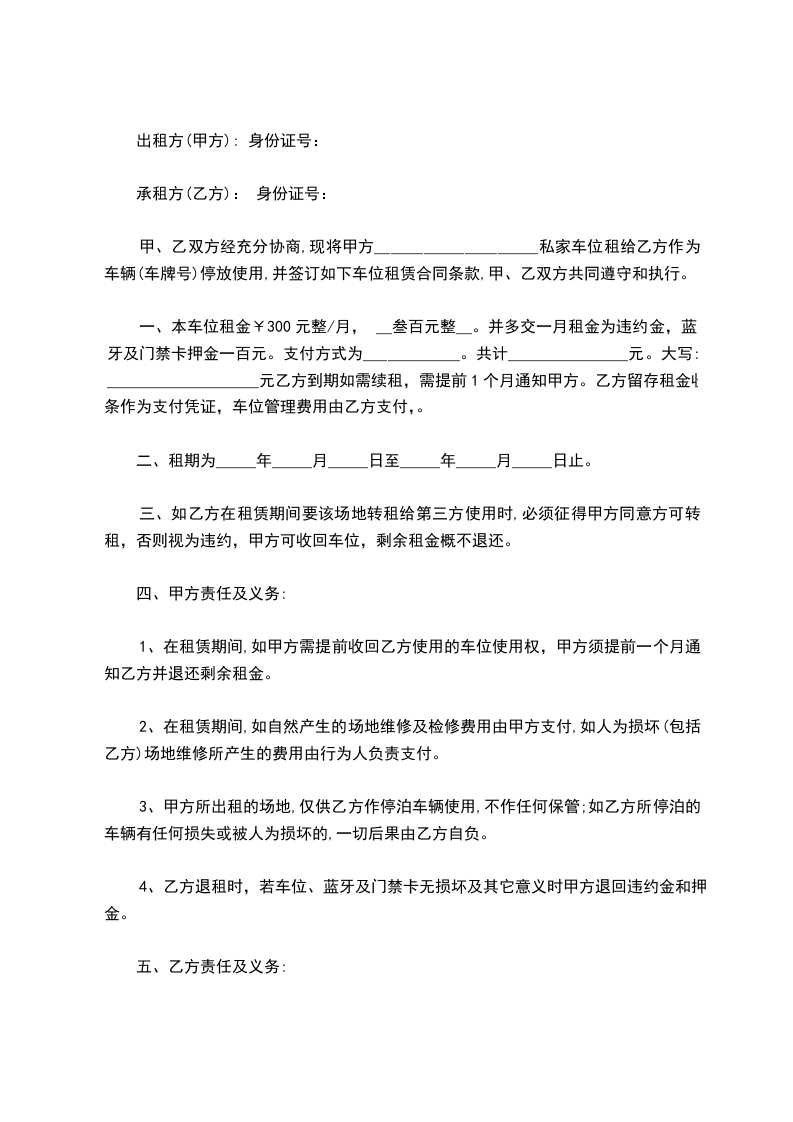 4、未经甲方同意,乙方不得将本停车位转租、转借任何第三人使用。否则,甲方有权解除合同。
