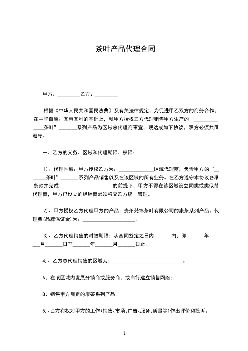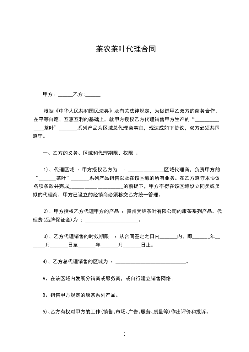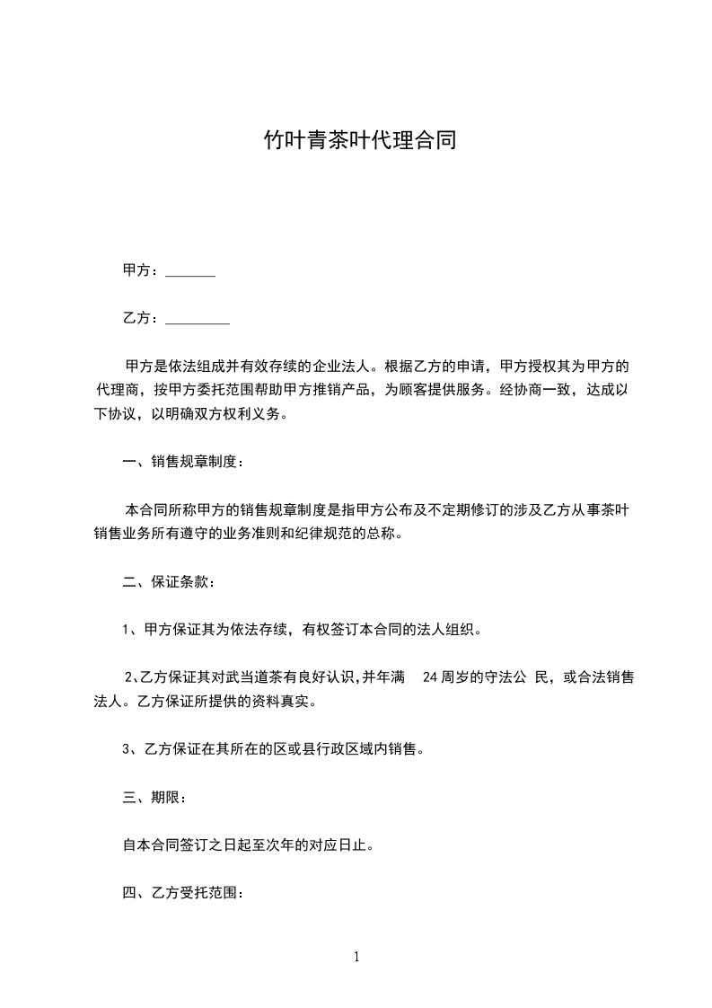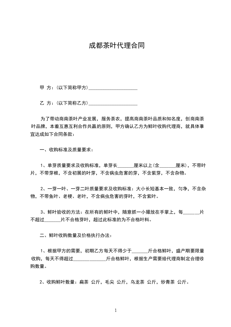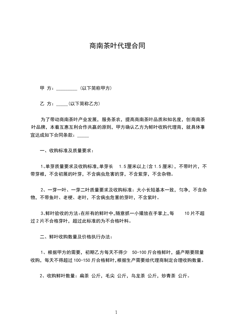为了带动商南茶叶产业发展,服务茶农,提高商南茶叶品质和知名度,创商南茶叶品牌,本着互惠互利合作共赢的原则,甲方确认乙方为鲜叶收购代理商,就具体事宜达成如下合同条款:
