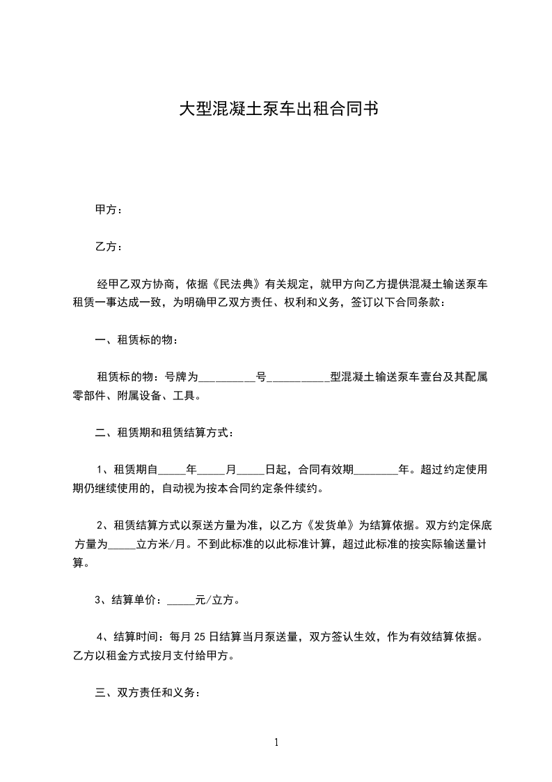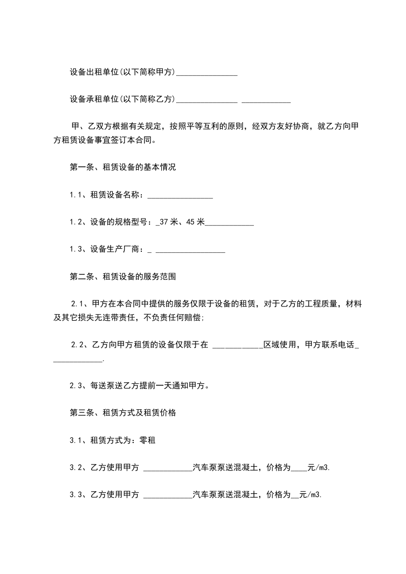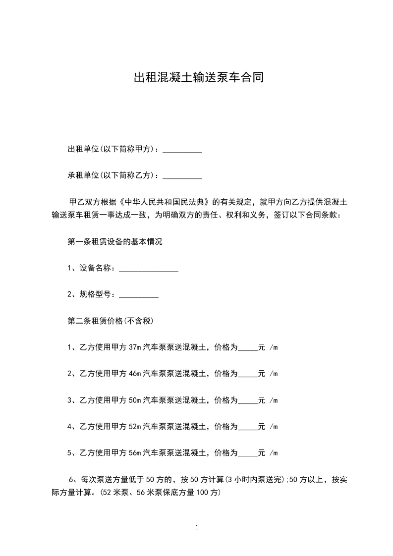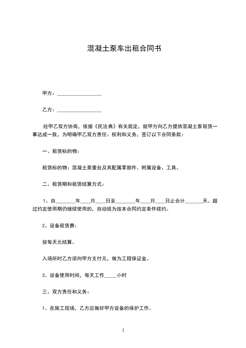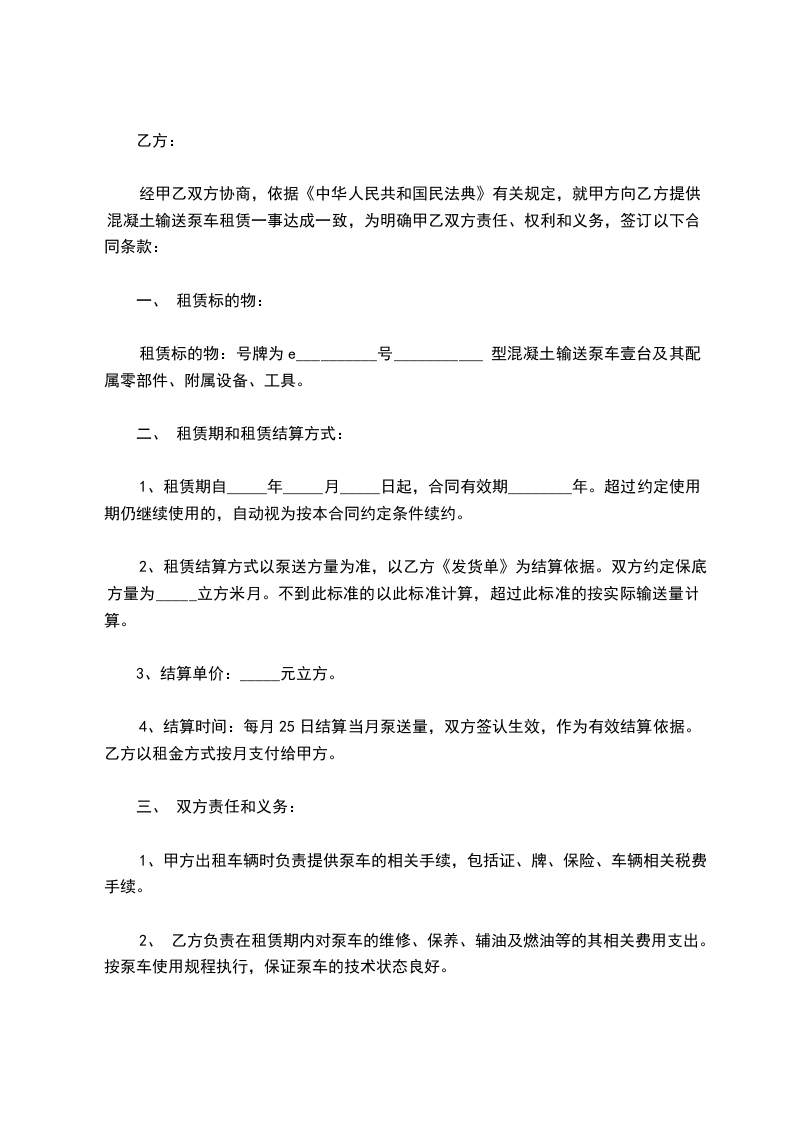 经甲乙双方协商,依据《民法典》有关规定,就甲方向乙方提供混凝土泵租赁一事达成一致,为明确甲乙双方责任、权利和义务,签订以下合同条款: