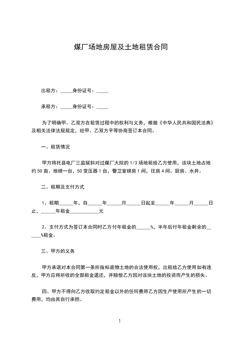 甲方将托县电厂三监狱斜对过煤厂大院的1/3场地租给乙方使用,该块土地占地约50亩。地磅一台,50变压器1台,警卫室磅房1间,往房4间、厨房、水井。