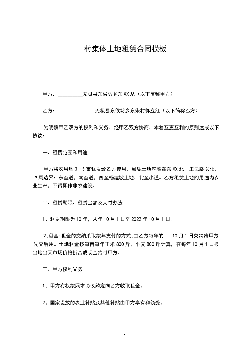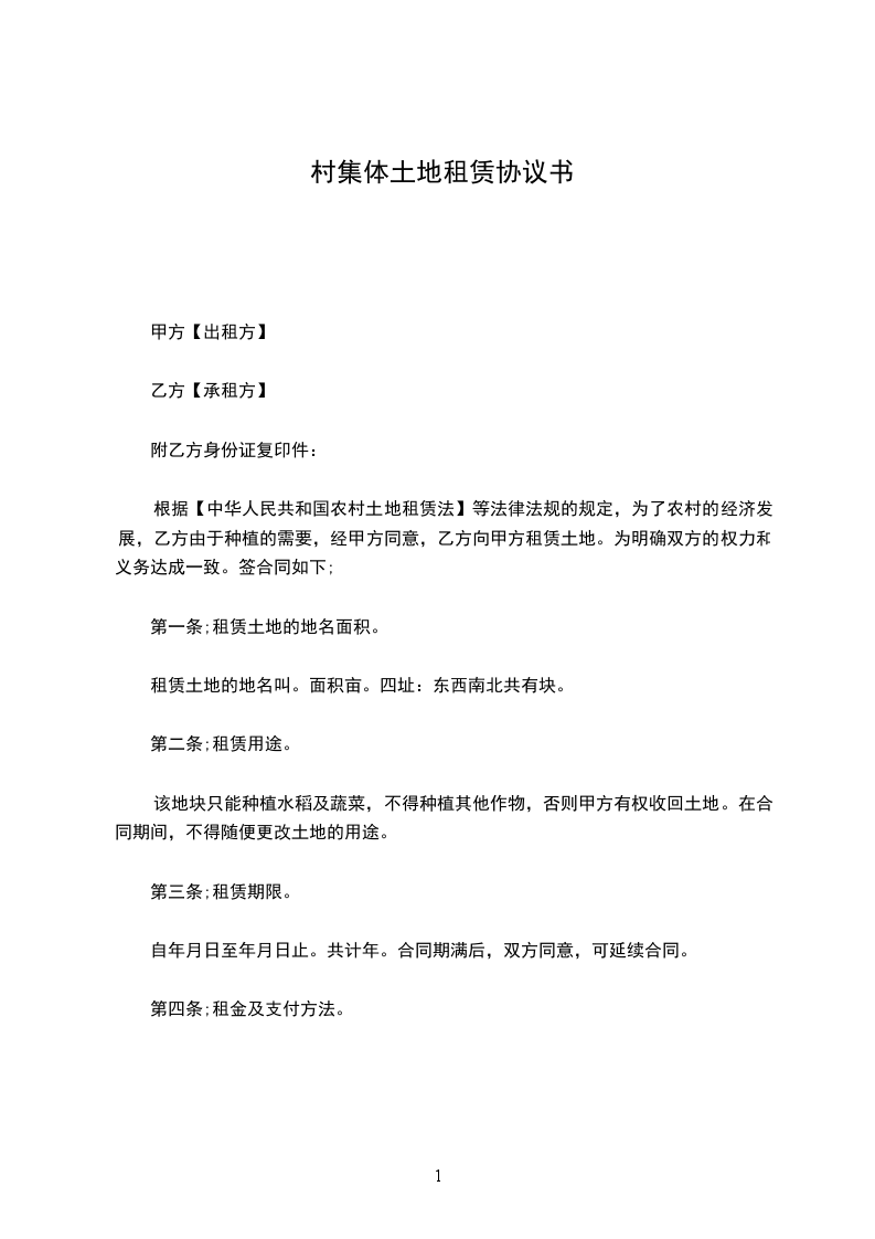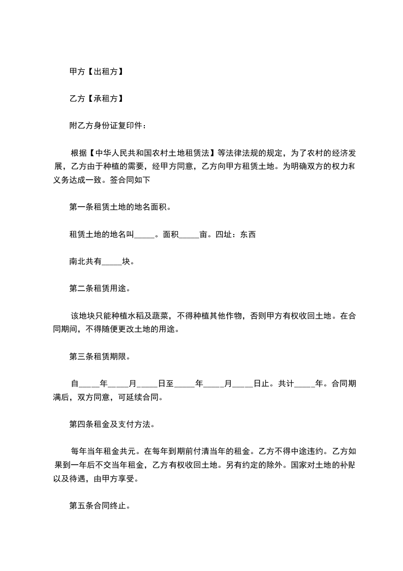 根据【中华人民共和国农村土地租赁法】等法律法规的规定,为了农村的经济发展,乙方由于种植的需要,经甲方同意,乙方向甲方租赁土地。为明确双方的权力和义务达成一致。签合同如下;