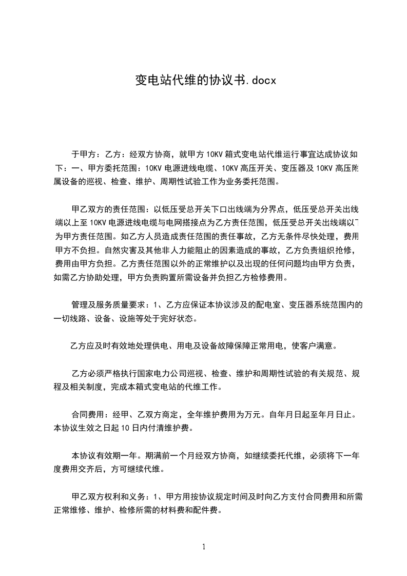 鉴于甲方拥有[变电站具体名称]变电站,乙方具备变电站维护的专业资质和能力,双方经友好协商,达成如下协议: