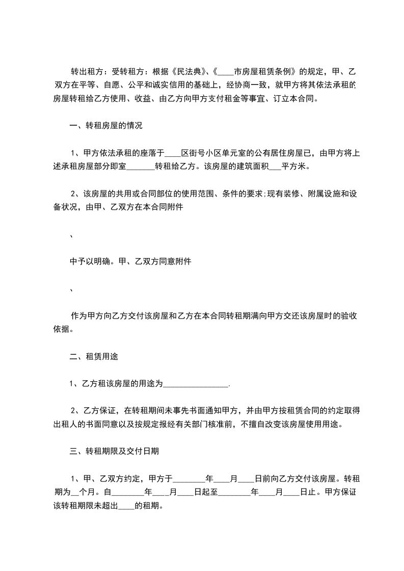 转出租方:受转租方:根据《民法典》、《____市房屋租赁条例》的规定,甲、乙双方在平等、自愿、公平和诚实信用的基础上,经协商一致,就甲方将其依法承租的房屋转租给乙方使用、收益、由乙方向甲方支付租金等事宜、订立本合同。