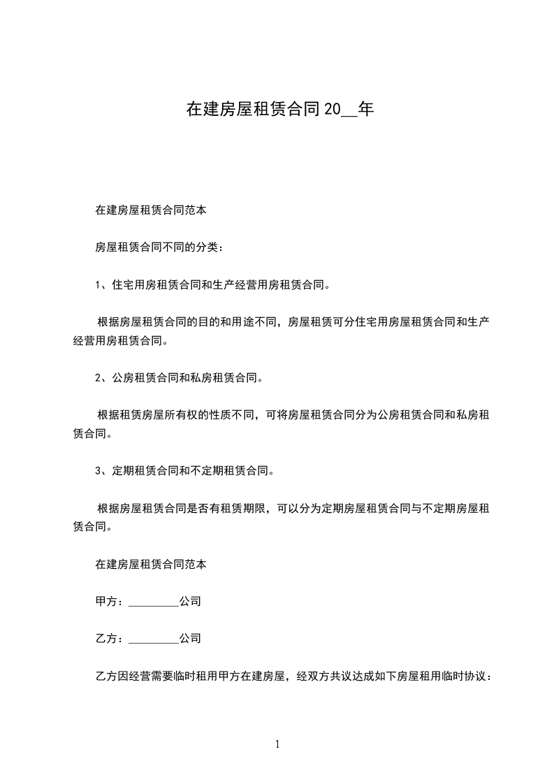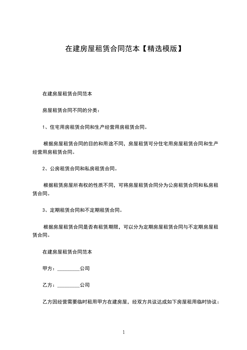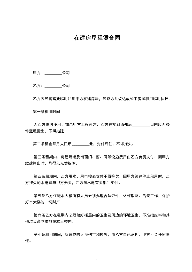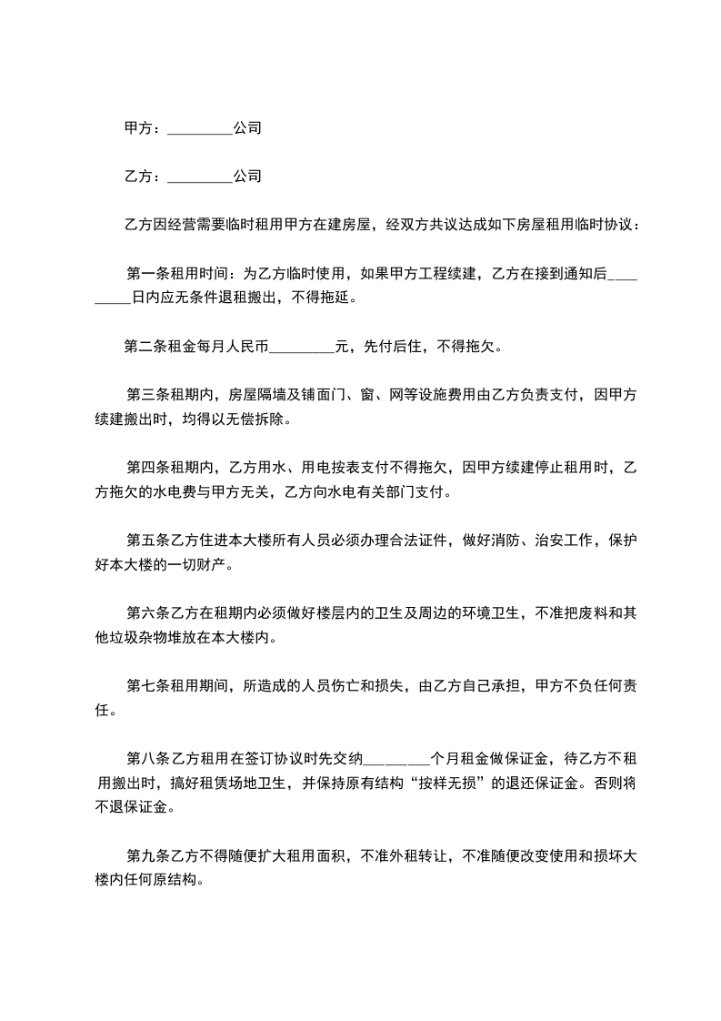 乙方因经营需要临时租用甲方在建房屋,经双方共议达成如下房屋租用临时协议: