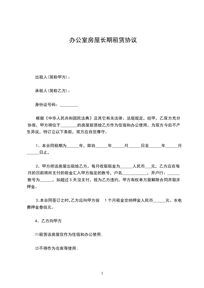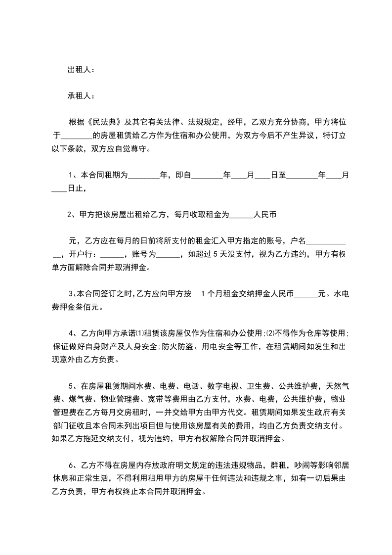 根据《民法典》及其它有关法律、法规规定,经甲,乙双方充分协商,甲方将位于________的房屋租赁给乙方作为住宿和办公使用,为双方今后不产生异议,特订立以下条款,双方应自觉尊守。