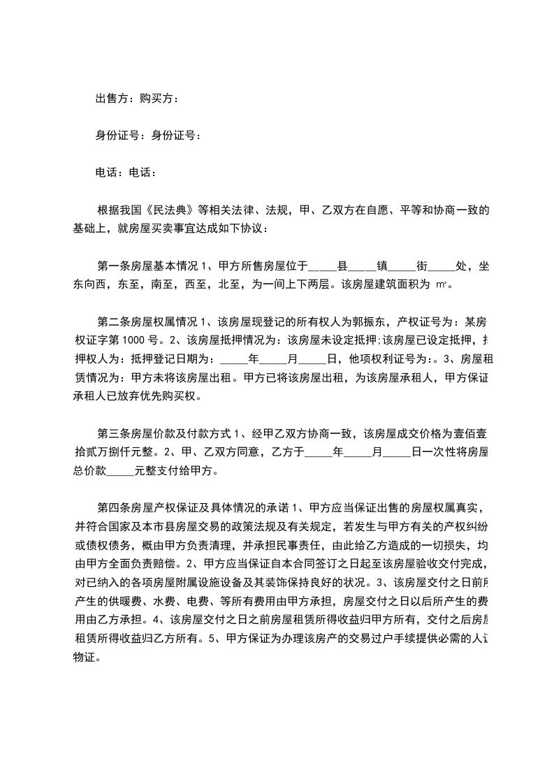 第二条房屋权属情况1、该房屋现登记的所有权人为郭振东,产权证号为:某房权证字第1000号。2、该房屋抵押情况为:该房屋未设定抵押;该房屋已设定抵押,抵押权人为:抵押登记日期为:_____年_____月_____日,他项权利证号为:。3、房屋租赁情况为:甲方未将该房屋出租。甲方已将该房屋出租,为该房屋承租人,甲方保证承租人已放弃优先购买权。