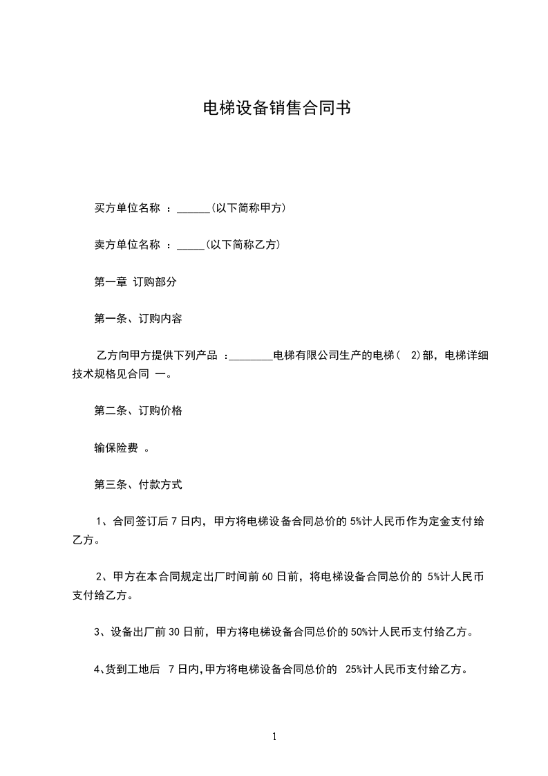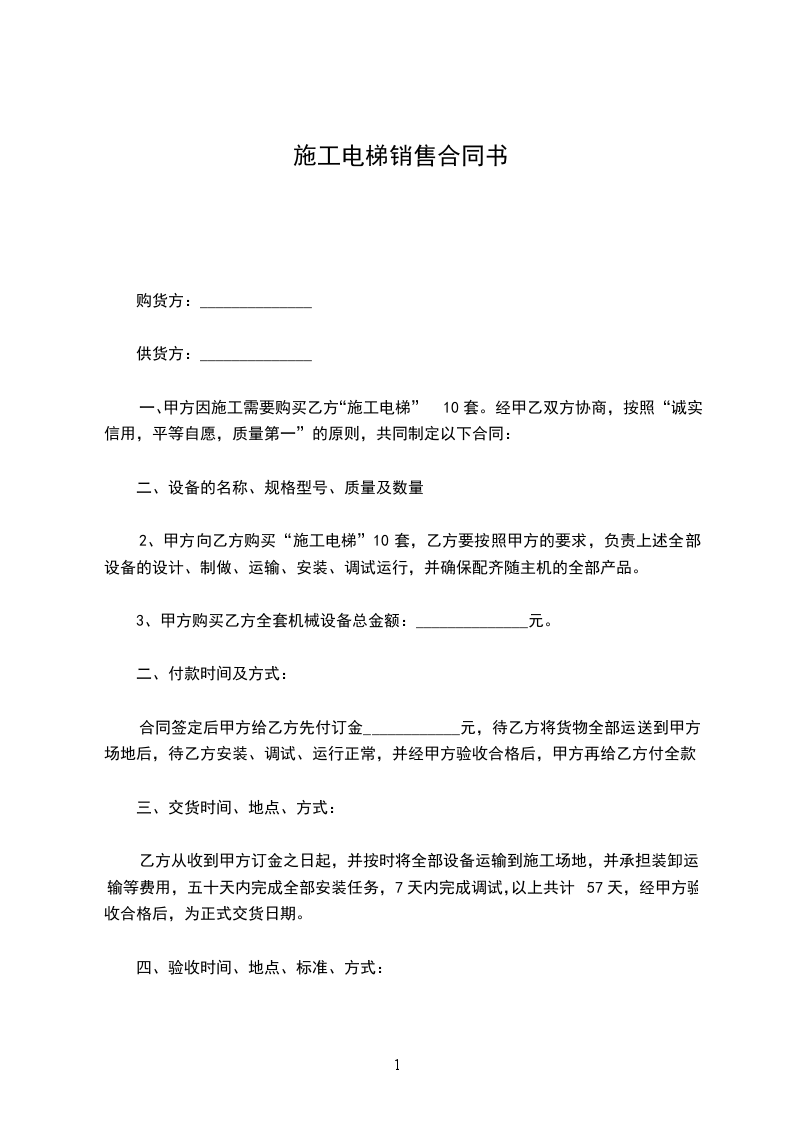 一、甲方因施工需要购买乙方“施工电梯”10套。经甲乙双方协商,按照“诚实信用,平等自愿,质量第一”的原则,共同制定以下合同: