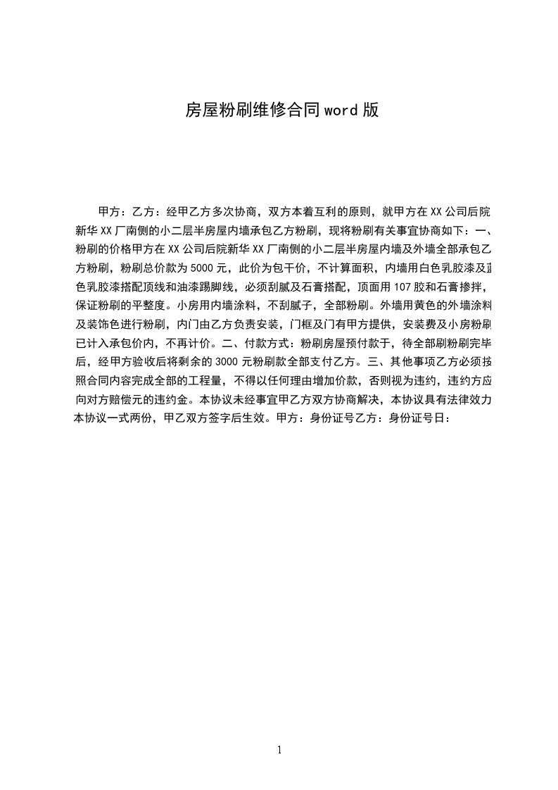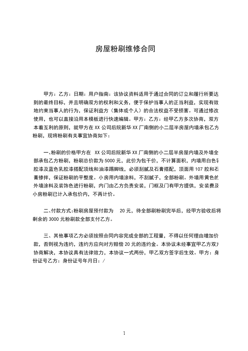 粉刷房屋预付款为20xx元,待全部刷粉刷完毕后,经甲方验收后将剩余的3000元粉刷款全部支付乙方。